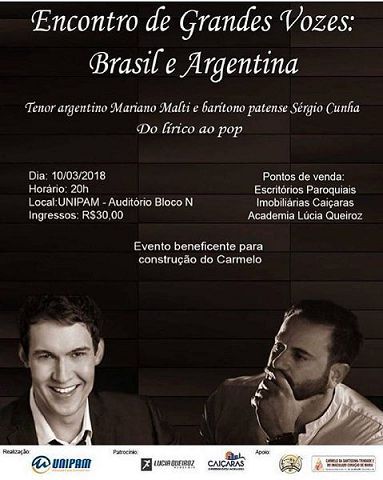 O Centro Universitário de Patos de Minas (UNIPAM) promoverá no próximo sábado (10), às 20h, no auditório do Bloco N, o evento “Encontro de Grandes Vozes Brasil e Argentina”, que contará com as presenças do barítono patense, Sérgio Cunha e do tenor argentino, Mariano Malti.