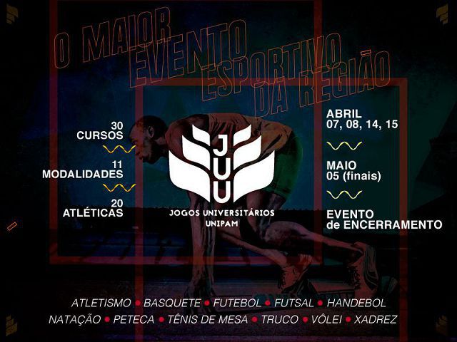 Vinte e dois cursos do UNIPAM participarão do evento, disputando nas modalidades de atletismo, de basquete, de futebol, de futsal, de handebol, de natação, de peteca, de tênis de mesa, de truco, de vôlei e de xadrez.