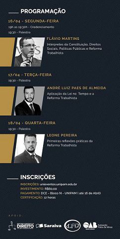 Para encerrar, na quarta-feira (18), Leone Pereira abordará o tema “Primeiras Reflexões Práticas da Reforma Trabalhista”.