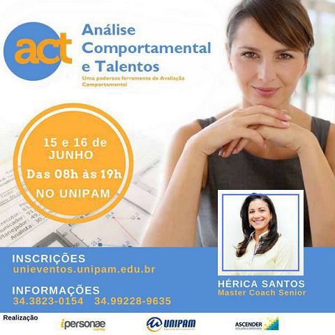 A Ascender e o Instituto Ipersonae promoverá nos dias 15 e 16 de junho, das 8h às 19h, no OceanO, no Centro Universitário de Patos de Minas (UNIPAM), o treinamento “Análise de Comportamento e Talentos (ACT)”, com a facilitadora Herica Santos.