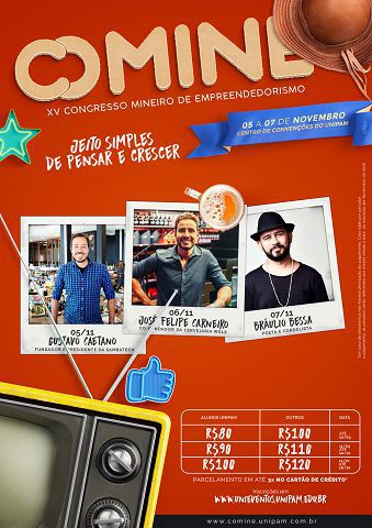 O Centro Universitário de Patos de Minas (UNIPAM) promoverá de 5 a 9 de novembro, a XV edição do Congresso Mineiro de Empreendedorismo (COMINE), que este ano tem como tema “Jeito simples de pensar e crescer”. De 5 a 7 de novembro, o COMINE acontecerá no Centro de Convenções e Eventos (CCE) e nos dias 8 e 9 de novembro, no bloco N da instituição.