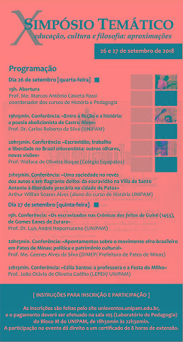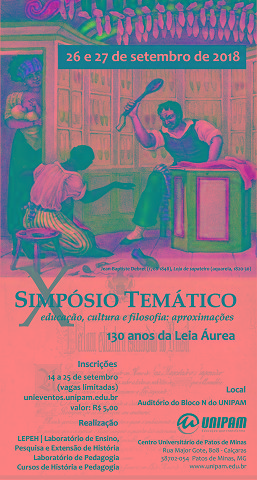 O Laboratório de Ensino, Pesquisa e Extensão de História (LEPEH) e o Laboratório de Pedagogia do Centro Universitário de Patos de Minas (UNIPAM) realizarão nos dias 26 e 27 de setembro, no auditório do bloco N, o X Simpósio Temático – educação, cultura e filosofia: aproximações. Este ano, o evento terá como tema “130 anos da Lei Áurea”.