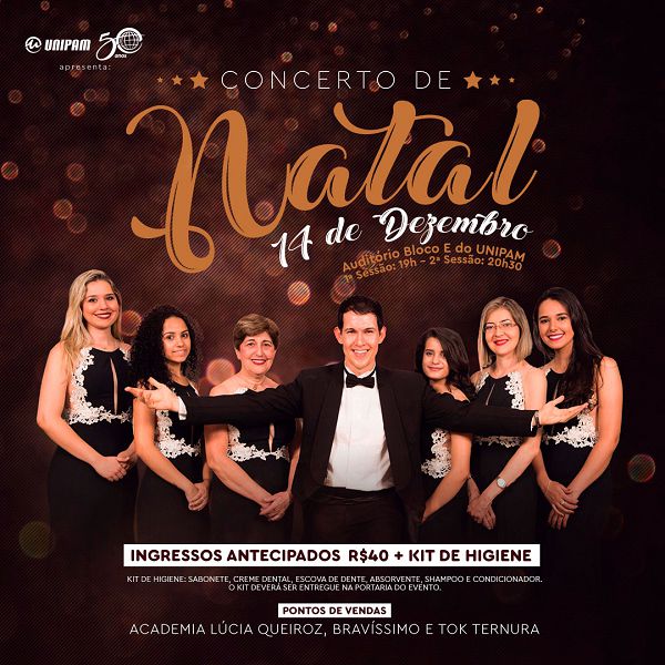O barítono Sérgio Cunha, com a participação do Grupo Cantares e de artistas convidados fará no dia 14 de dezembro, um Concerto de Natal. O espetáculo contará com duas sessões sendo uma às 19h e a outra às 20h30 no auditório do bloco E, no campus do Centro Universitário de Patos de Minas (UNIPAM).