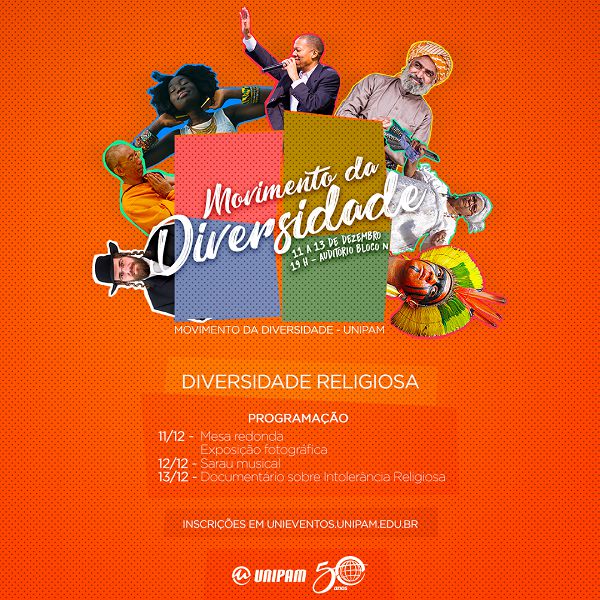 A Pró-Reitoria de Ensino Pesquisa e Extensão por meio do Departamento de Desenvolvimento de Pessoas do Centro Universitário de Patos de Minas (UNIPAM) realizará de 11 a 13 de dezembro, às 19h, no auditório do Bloco N, no campus da instituição, o “Movimento da Diversidade”.