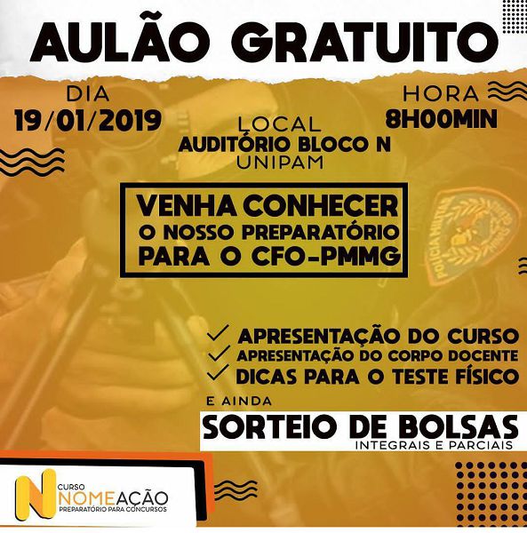 O “Aulão Gratuito” contará com análise do edital, aplicação de técnicas e planos de estudos para concursos públicos, motivação, instruções iniciais pra a avaliação física militar e aulas com conteúdo gratuito para o concurso do CFO da Polícia Militar de Minas Gerais. E ainda sorteio de bolsas integrais e parciais.