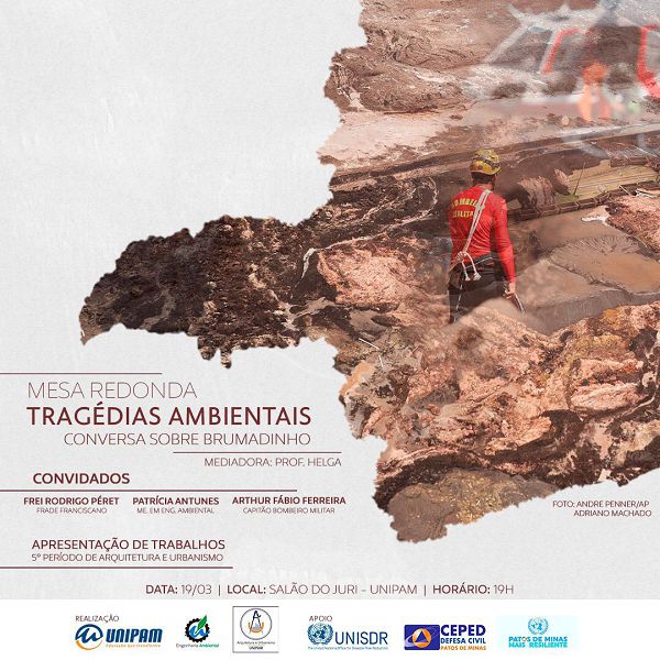 Os cursos de Arquitetura e Urbanismo e Engenharia Ambiental do Centro Universitário de Patos de Minas (UNIPAM) promoverão nesta terça-feira (19), às 19h, no Salão do Júri da instituição, a mesa redonda: “Tragédias ambientais – conversa sobre Brumadinho”.
