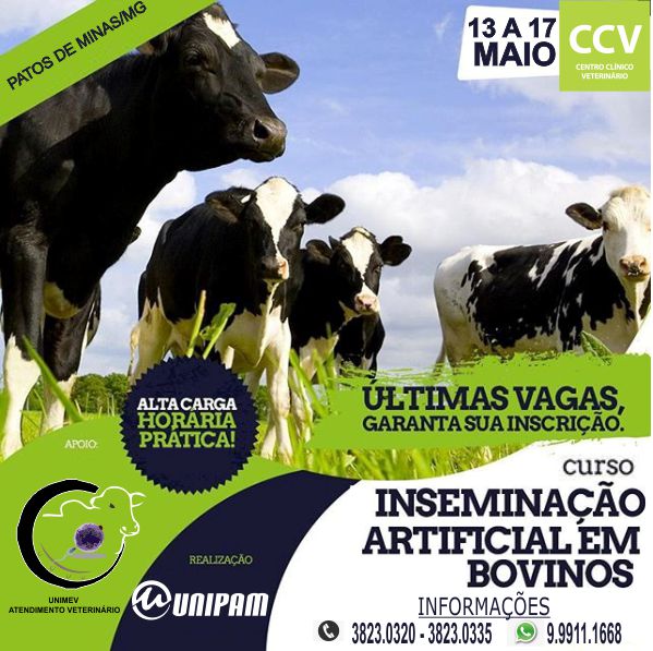 Será realizado de 13 a 17 de maio, no Centro Clínico Veterinário (CCV) do Centro Universitário de Patos de Minas (UNIPAM), o curso “Inseminação Artificial de Bovinos”.
