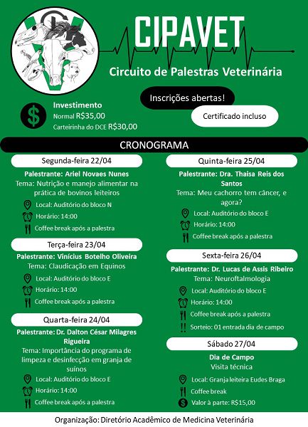 O Diretório Acadêmico (DA) do curso de Medicina Veterinária do Centro Universitário de Patos de Minas (UNIPAM) promoverá de 22 a 26 de abril, a partir das 14h, o Circuito de Palestras Veterinária (CIPAVET). No dia 27 de abril será realizado um Dia de Campo, com visita técnica a Granja Leiteira Eudes Braga. A abertura do evento será realizada no auditório do bloco N. Nos demais dias do evento, de 23 a 26 de abril, as palestras acontecerão no auditório do bloco E.