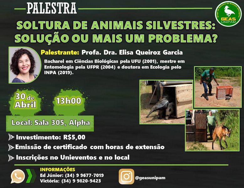 O Grupo de Estudos de Animais Selvagens (GEAS) do Centro Universitário de Patos de Minas (UNIPAM) promoverá no dia 30 de abril, às 13h, na sala 305 do bloco Alpha, a palestra “Soltura de animais silvestres: solução ou mais um problema?”.