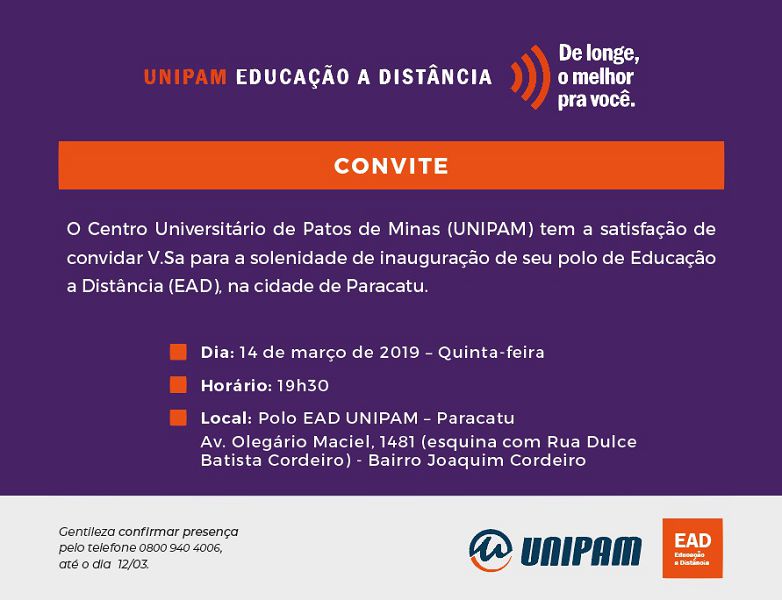 O Centro Universitário de Patos de Minas (UNIPAM) realizará a inauguração de mais um super polo de cursos de educação a distância, dessa vez, na cidade de Paracatu, localizada a cerca de 200 km da capital do milho. O polo de apoio presencial será inaugurado na próxima quinta-feira (14), às 19h30, na Avenida Olegário Maciel esquina com Rua Dulce Batista Cordeiro, número 1481, bairro Joaquim Cordeiro. O evento de inauguração será aberto para a comunidade.