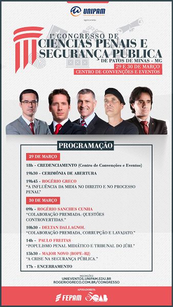 O evento contará com a presença do jurista, professor e Procurador de Justiça do Ministério Público do Estado de Minas Gerais, Rogério Greco; do Promotor de Justiça do MP/SP, Rogério Sanches Cunha; do Procurador da República, Deltan Dallagnol; do Promotor de Justiça do MP/MG, Paulo César de Freitas e do Major Novo, do Bope do Rio de Janeiro.
