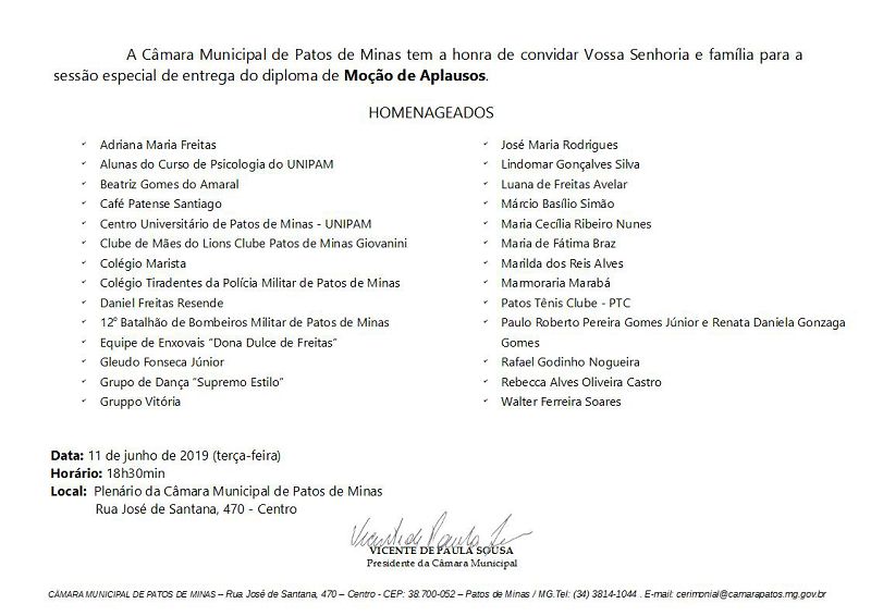 A Câmara Municipal de Patos de Minas realizará nesta terça-feira (11), às 18h30, no Plenário, a sessão especial de entrega do diploma de “Moção de Aplausos”.