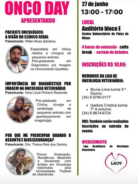 A Liga Acadêmica de Oncologia Veterinária (LAOV) do Centro Universitário de Patos de Minas (UNIPAM) realizará nesta quinta-feira (27), a partir das 13h, no auditório do Bloco E, o evento “ONCO DAY”.