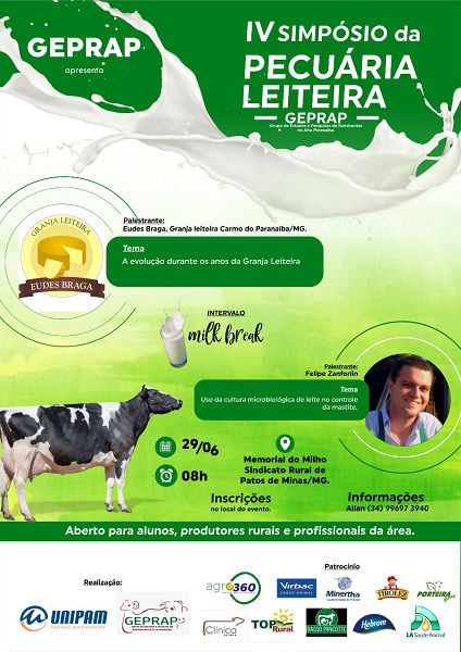 O Grupo de Estudos de Pesquisas de Ruminantes no Alto Paranaíba (GEPRAP) em parceria com o Centro Universitário de Patos de Minas (UNIPAM) promoverão neste sábado (29), às 8h, no Memorial do Milho do Sindicato Rural, o IV Simpósio da Pecuária Leiteira.