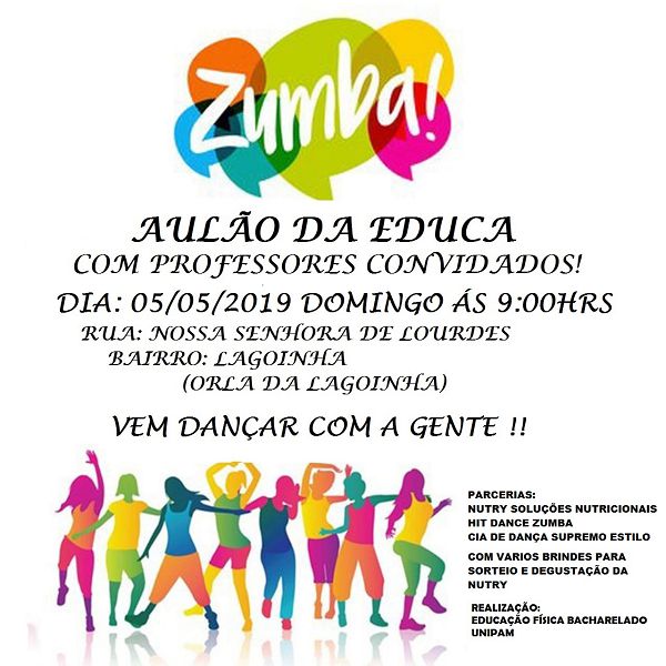 O curso de Educação Física do Centro Universitário de Patos de Minas (UNIPAM) promoverá no dia 05 de maio (domingo), às 9h, na Orla da Lagoinha, o “Aulão da Educa”. O evento será promovido pelos alunos do 1º período (bacharel), orientados pela professora da disciplina de “Recreação e Lazer”, Rejane Martins.