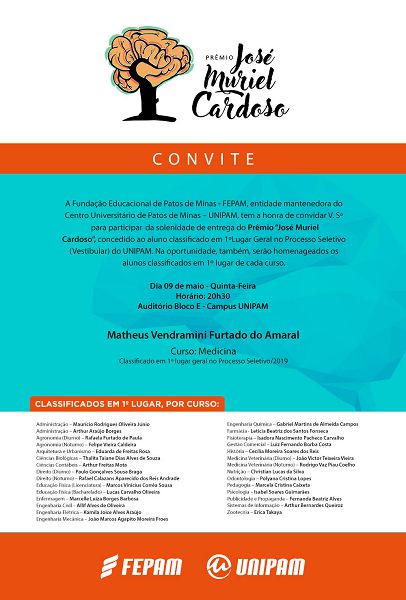 A Fundação Educacional de Patos de Minas (FEPAM) e o Centro Universitário de Patos de Minas (UNIPAM) realizarão nesta quinta-feira (09), às 20h30, no auditório do bloco E, a solenidade de entrega do Prêmio “José Muriel Cardoso”.