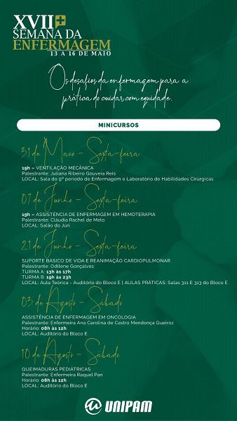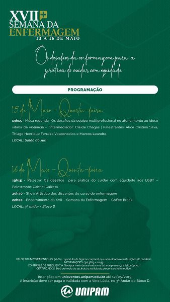 Será promovida nesta segunda-feira (13), no Salão do Júri do Centro Universitário de Patos de Minas (UNIPAM), a abertura da XVII Semana Acadêmica do curso de Enfermagem.