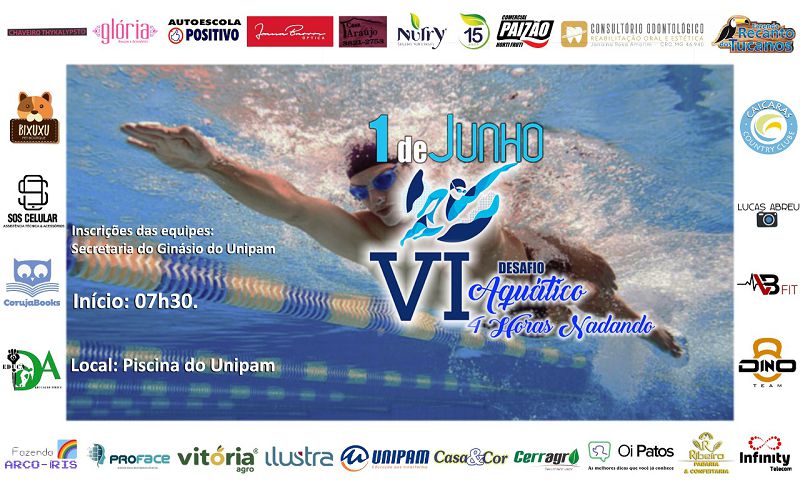 O curso de Educação Física do Centro Universitário de Patos de Minas (UNIPAM) promoverá no dia 1º de junho (sábado), a partir das 7h30, na piscina da instituição, o VI “Desafio Aquático”.