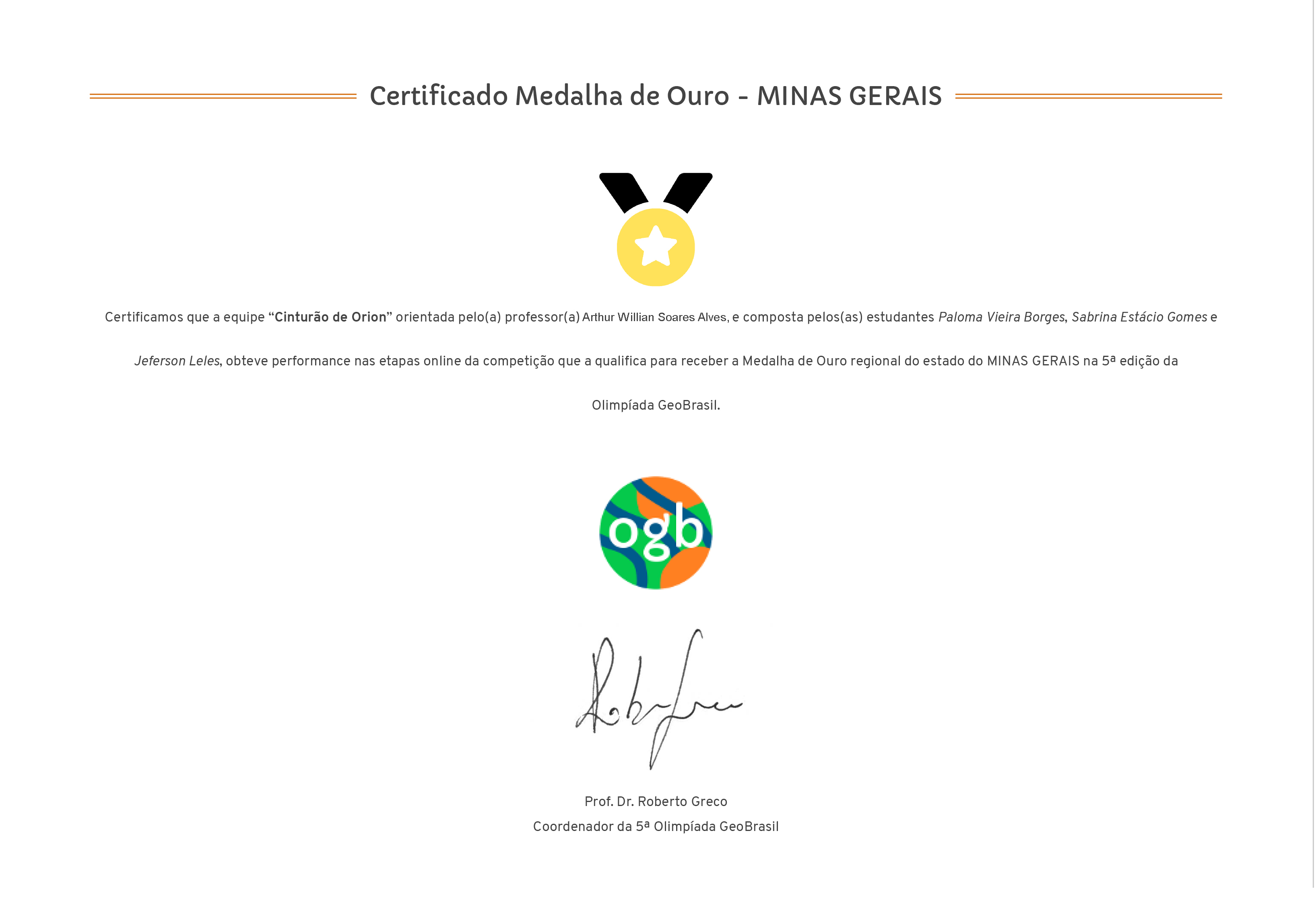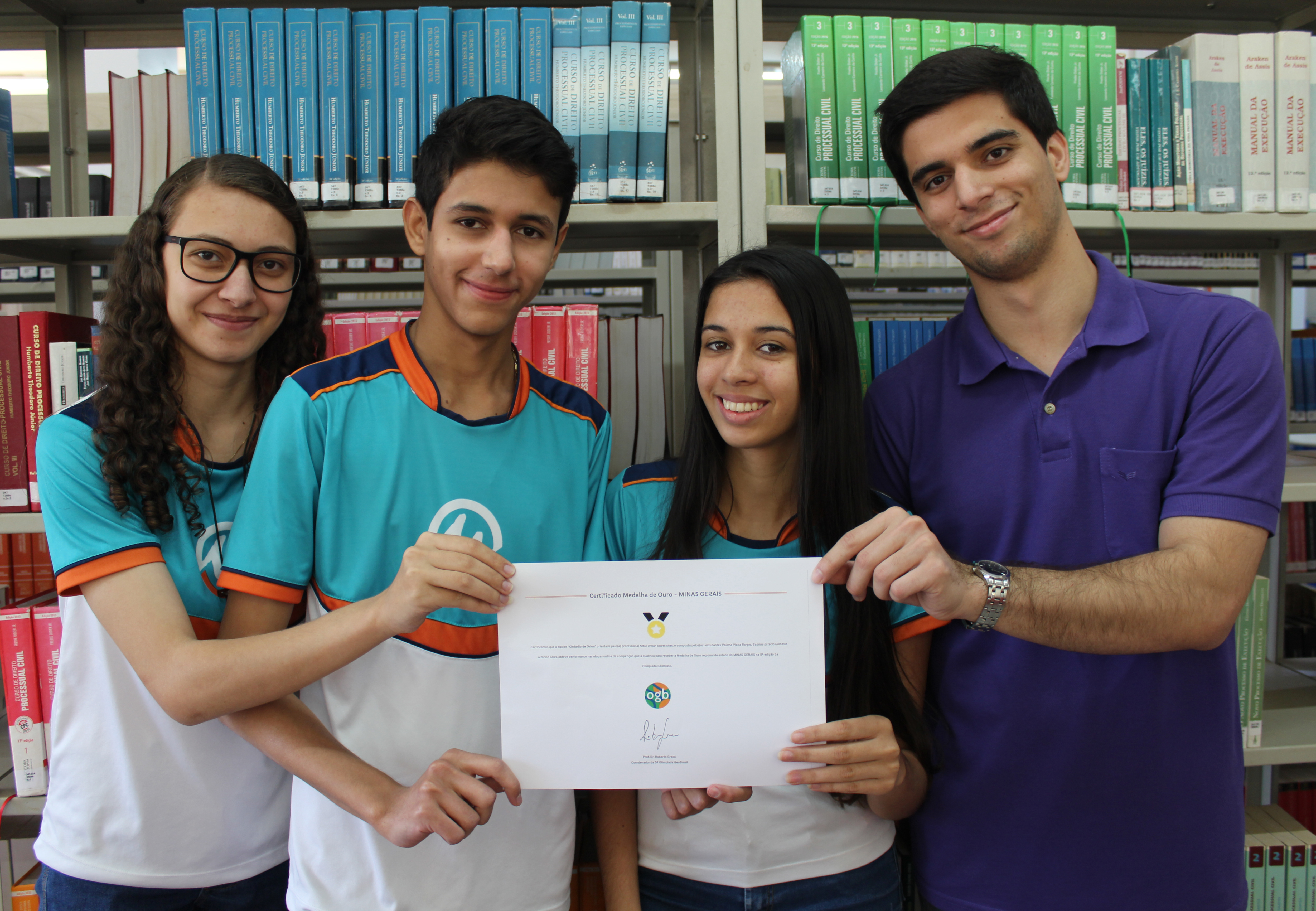 Jeferson Leles, Paloma Vieira Borges e Sabrina Estácio Gomes, alunos do 1º e 2º ano, respectivamente, do Ensino Médio do Centro Universitário de Patos de Minas (UNIPAM), sob orientação do professor de Geografia, Arthur Willian Soares Alves, receberam no dia 30 de agosto, a Medalha de Ouro regional do Estado de Minas Gerais, da 5ª edição da Olimpíada GeoBrasil.