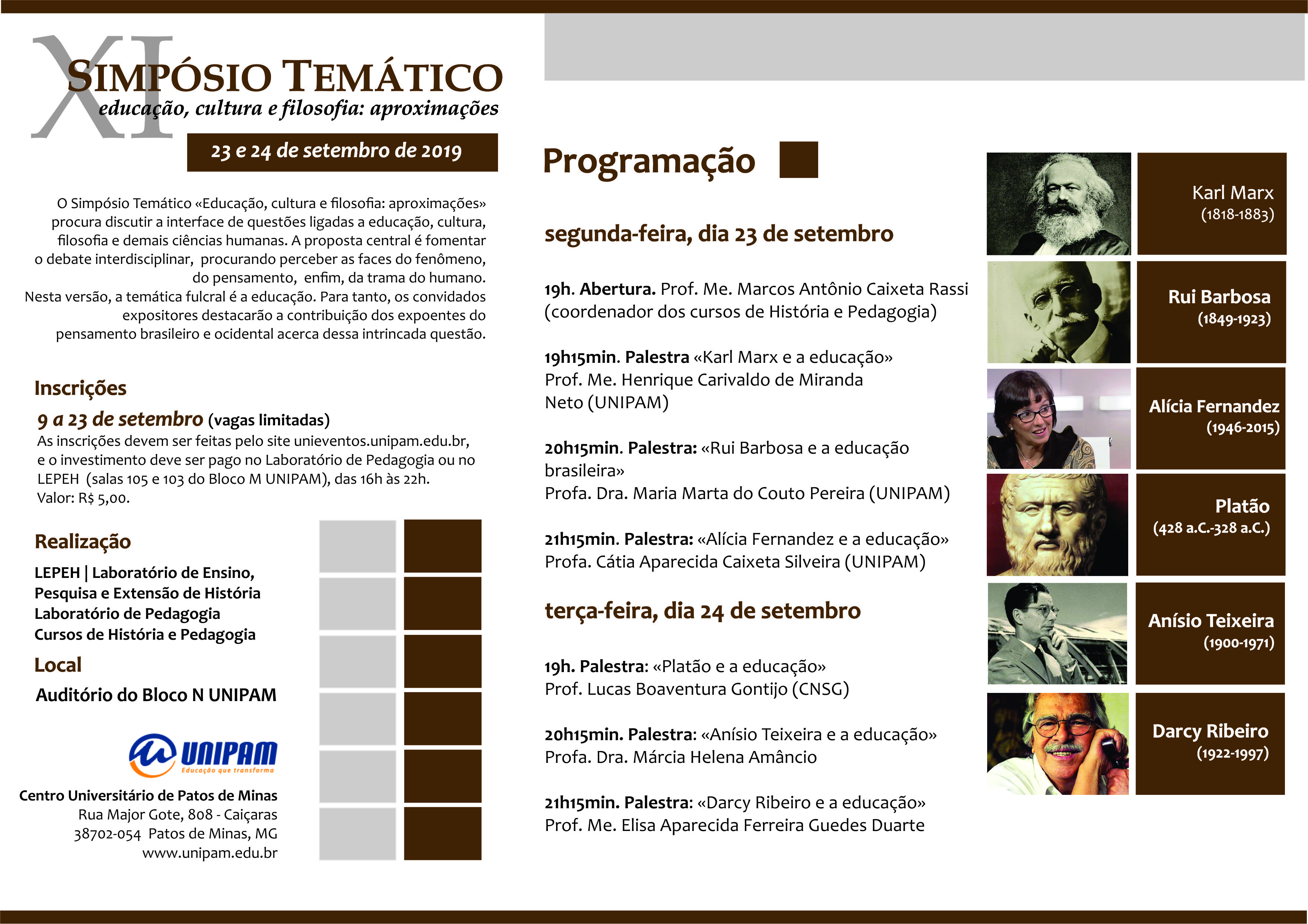 O Laboratório de Ensino, Pesquisa e Extensão de História (LEPEH) e o Laboratório de Pedagogia do Centro Universitário de Patos de Minas (UNIPAM) promoverão nos dias 23 e 24 de setembro, no auditório do bloco N, o “XI Simpósio Temático: educação, cultura e filosofia – aproximações”.
