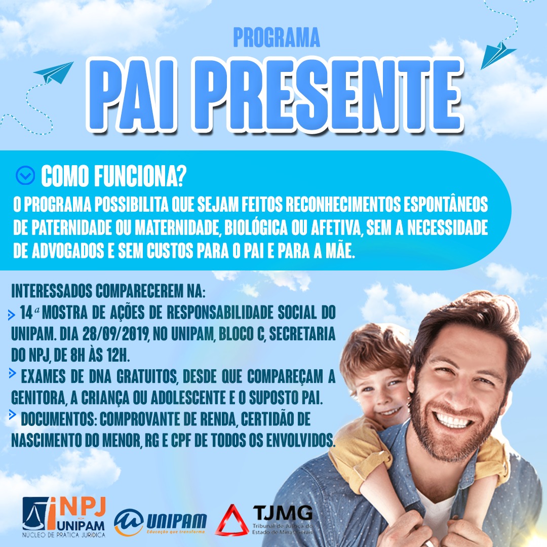 O curso de Direito do Centro Universitário de Patos de Minas (UNIPAM) e o Centro Judiciário de Solução de Conflitos e Cidadania (CEJUSC/TJMG), realizarão no dia 28 de setembro, das 8h às 12h, no Núcleo de Prática Jurídica (NPJ), localizado no bloco C, o programa “Pai Presente em Patos de Minas”.
