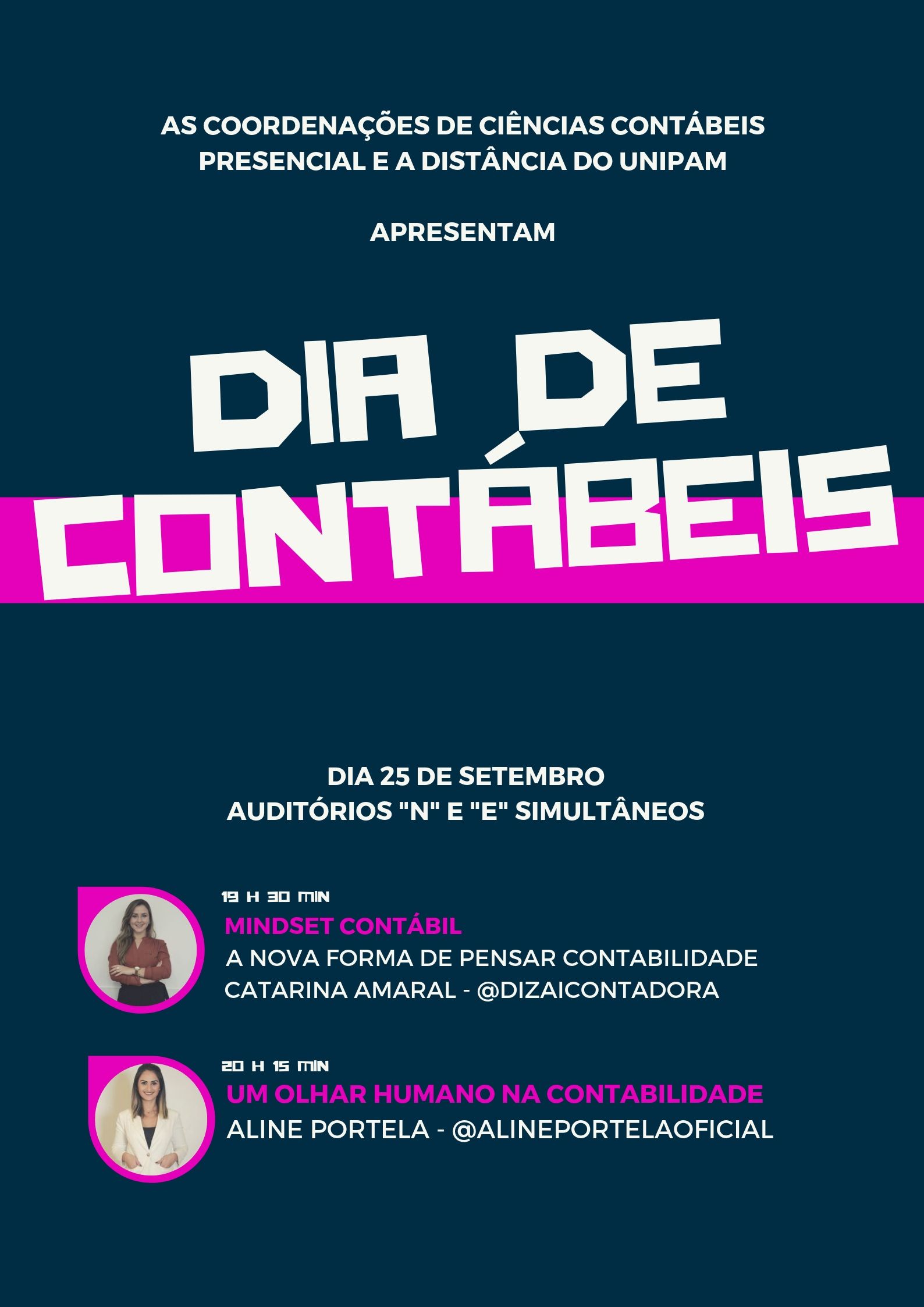 Será promovido nesta quarta-feira (25), às 19h30, no auditório do bloco E e no auditório do bloco N do Centro Universitário de Patos de Minas (UNIPAM), o evento “Dia de Contábeis”.