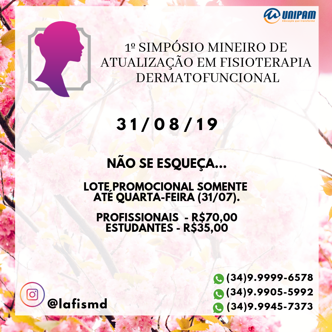A Liga Acadêmica de Fisioterapia na Saúde do Homem e da Mulher e Dermatofuncional (LAFISMD) do curso de Fisioterapia do Centro Universitário de Patos de Minas (UNIPAM) promoverá no dia 31 de agosto (sábado), no auditório do bloco N, o “1º Simpósio Mineiro de Atualização em Fisioterapia Dermatofuncional”. O Simpósio é coordenado pelas professoras do curso de Fisioterapia, Kelly Christina de Faria Nunes e Lays Magalhães Braga.
