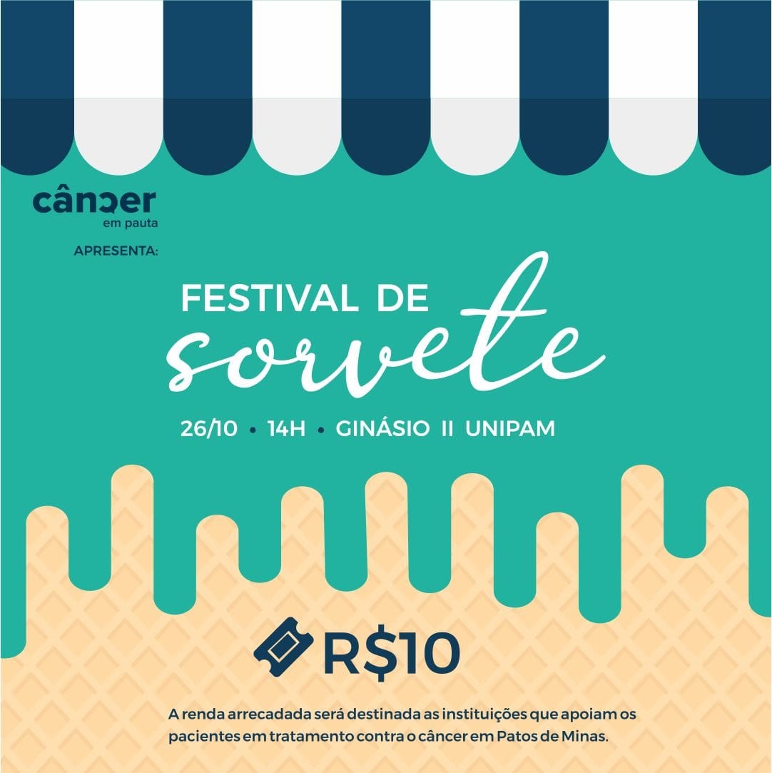 Alunos do 8º período do curso de Jornalismo do Centro Universitário de Patos de Minas (UNIPAM), integrantes do site “Câncer em Pauta”, promoverão no dia 26 de outubro, às 14h, no Ginásio II do UNIPAM, o Festival de Sorvete beneficente, em prol das instituições que apoiam os pacientes em tratamento contra o câncer.