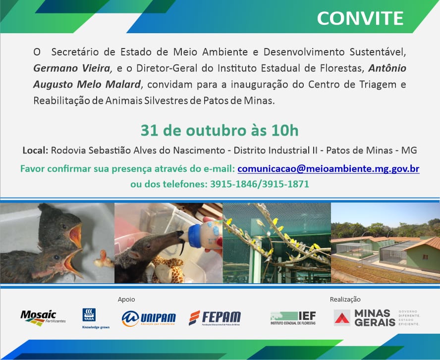 Será inaugurado nesta quinta-feira (31), às 10h, o Centro de Triagem e Reabilitação de Animais Silvestres de Patos de Minas (CETRAS), localizado na Rodovia Sebastião Alves do Nascimento – Distrito Industrial II.