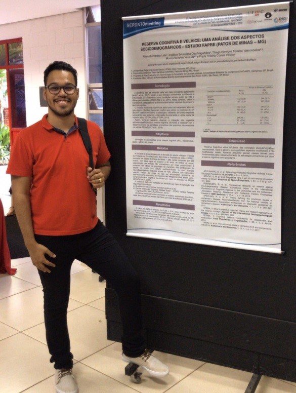 O ex-aluno do curso de Psicologia e pós-graduando da UFMG, Aislan Guimarães apresentou, respectivamente a produção “Reserva Cognitiva e Velhice: Uma Análise dos Aspectos Sociodemográficos – Estudo Fapre (Patos de Minas – MG)”. O projeto foi desenvolvido em parceria com o UNIPAM; com a Universidade Federal de Minas Gerais (UFMG); com a Escola de Artes, Ciências e Humanidades da Universidade de São Paulo (EACH-USP); e com a Faculdade de Ciências Médicas da Universidade Estadual de Campinas (UNICAMP).