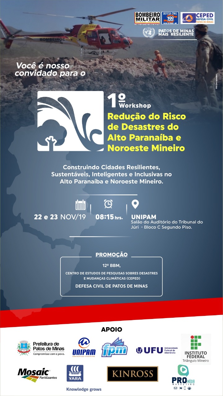 Será promovido nos dias 22 e 23 de novembro, o “1º Workshop sobre Redução do Risco de Desastres do Alto Paranaíba e Noroeste Mineiro”. O evento tem como tema “Construindo Cidades Resilientes, Sustentáveis, Inteligentes e Inclusivas no Alto Paranaíba e Noroeste Mineiro”.