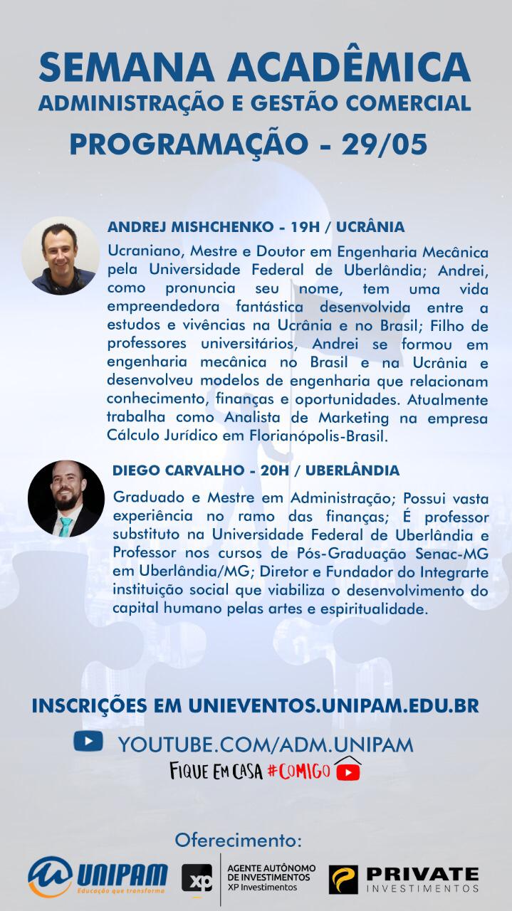 No último dia do evento, 29 de maio (sexta-feira), proferirão palestras: o ucraniano Andrej Mishchenko, Doutor em Engenharia Mecânica, responsável por desenvolver modelos de engenharia que relacionam conhecimento, finanças e oportunidades; e Diego Carvalho, Mestre em Administração, possui vasta experiência no ramo de finanças e é diretor e fundador do INTEGRARTE, instituição social que viabiliza o desenvolvimento do capital humano pelas artes e espiritualidade.