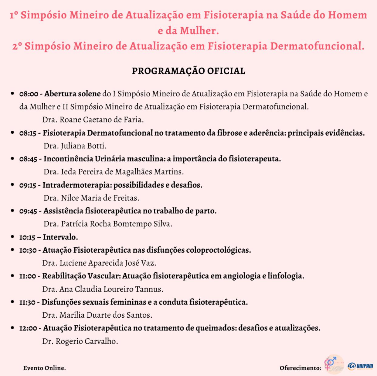 A Liga de Fisioterapia Dermatofuncional e da Saúde do Homem e da Mulher (LAFISMD) do curso de Fisioterapia do Centro Universitário de Patos de Minas (UNIPAM), promoverá no dia 22 de agosto (sábado), das 8h às 12h30, o “1° Simpósio Mineiro de Atualização em Fisioterapia na Saúde do Homem e da Mulher” e o “2º Simpósio Mineiro de Atualização em Fisioterapia Dermatofuncional”. O evento será transmitido por meio da plataforma Google Meet.