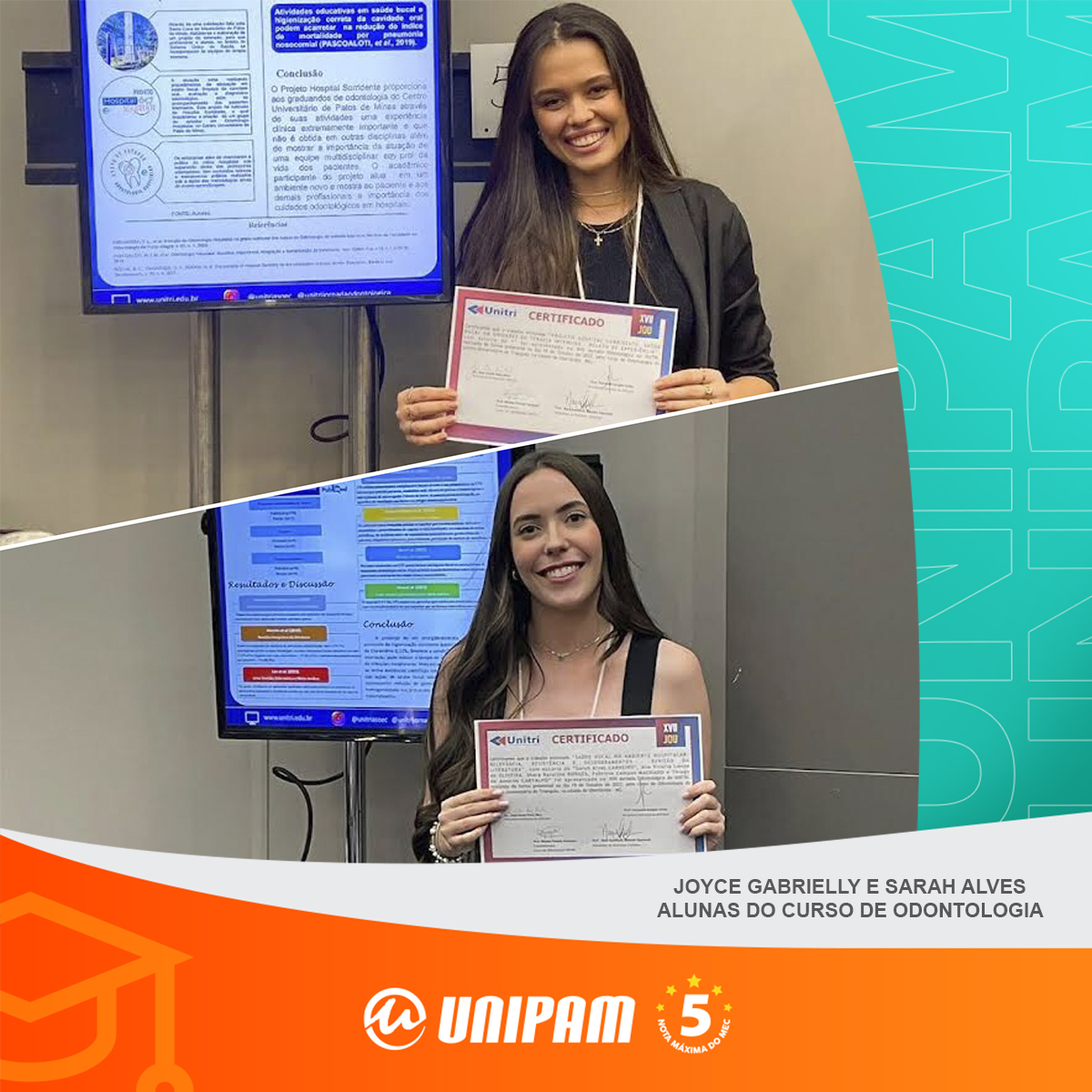 Joyce Gabrielly Barbosa Galvão e Sarah Alves Carneiro, alunas do curso de Odontologia do Centro Universitário de Patos de Minas (UNIPAM), receberam menções honrosas na XVII Jornada Odontológica, promovida no mês de outubro pelo Centro Universitário do Triângulo (UNITRI), em Uberlândia (MG).