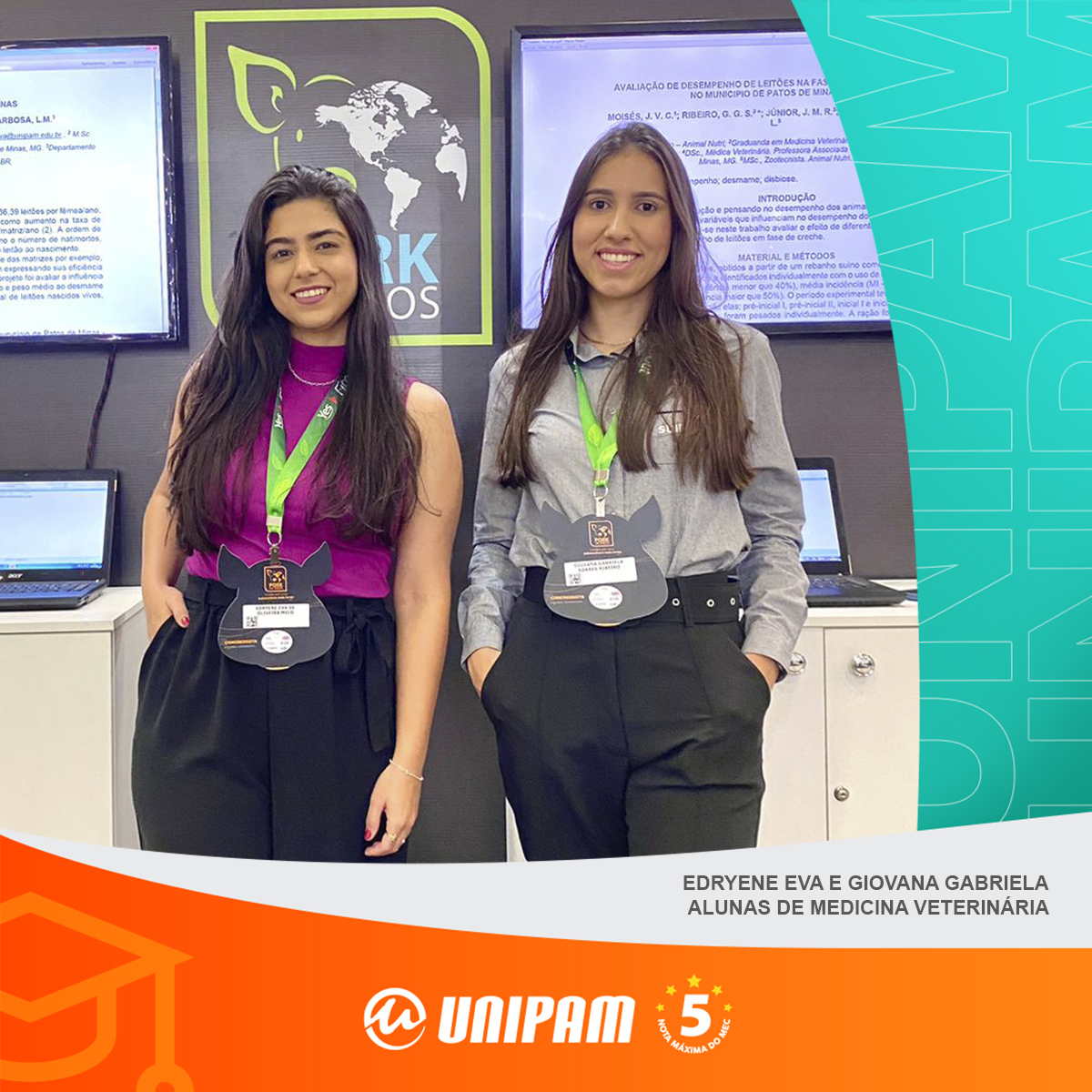 Edryene Eva de Oliveira Melo e Giovana Gabriela Soares Ribeiro, alunas do curso de Medicina Veterinária do Centro Universitário de Patos de Minas (UNIPAM), apresentaram recentemente trabalhos científicos no Congresso Latino-Americano de Suinocultura, realizado em Foz do Iguaçu (PR).