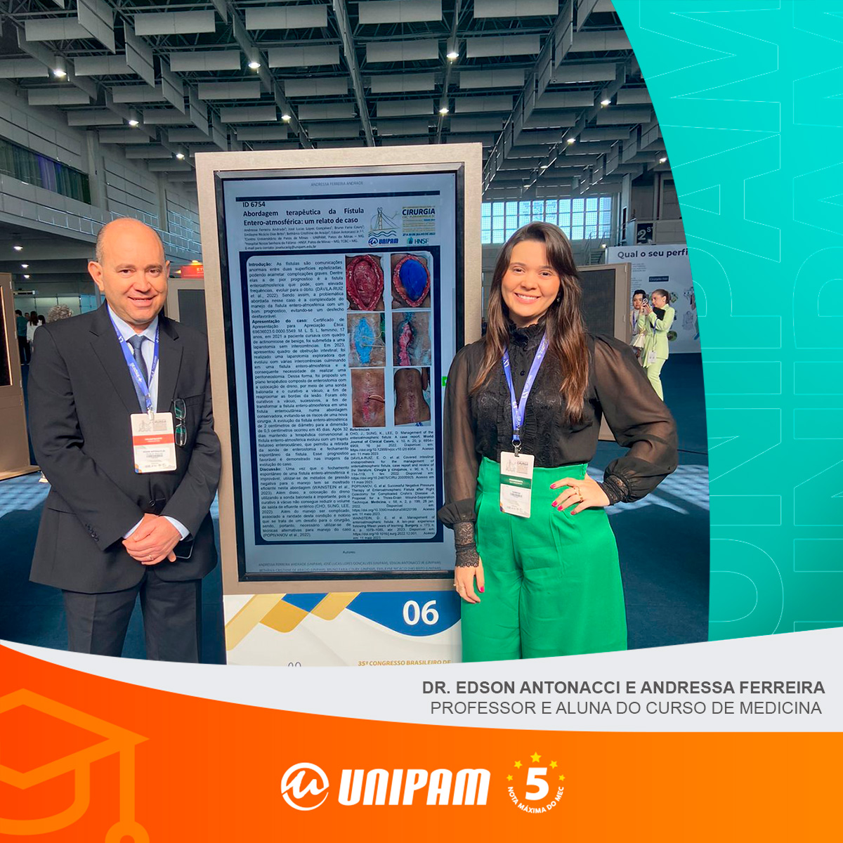 Andressa Ferreira Andrade, aluna do 10º período do curso de Medicina do Centro Universitário de Patos de Minas (UNIPAM), juntamente com o professor do curso, Dr. Edson Antonacci Júnior, participaram do 35º Congresso Brasileiro de Cirurgia, realizado no mês de julho, em Florianópolis (SC).