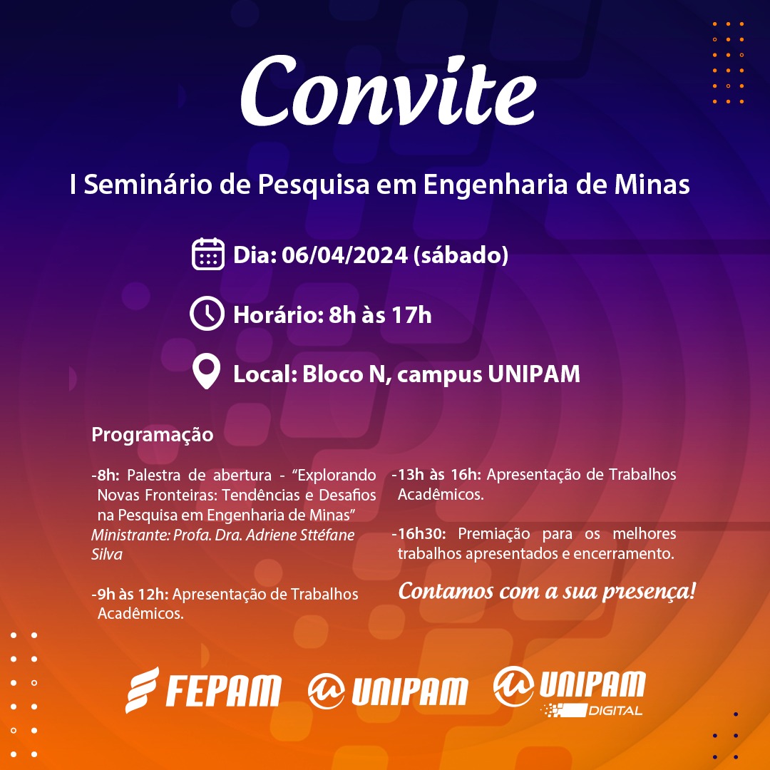 O Centro Universitário de Patos de Minas (UNIPAM), por meio do Núcleo de Educação Digital (NEAD), promoverá no dia 06 de abril (sábado), das 8h às 17h, no auditório do bloco N, o “I Seminário de Pesquisa em Engenharia de Minas”.