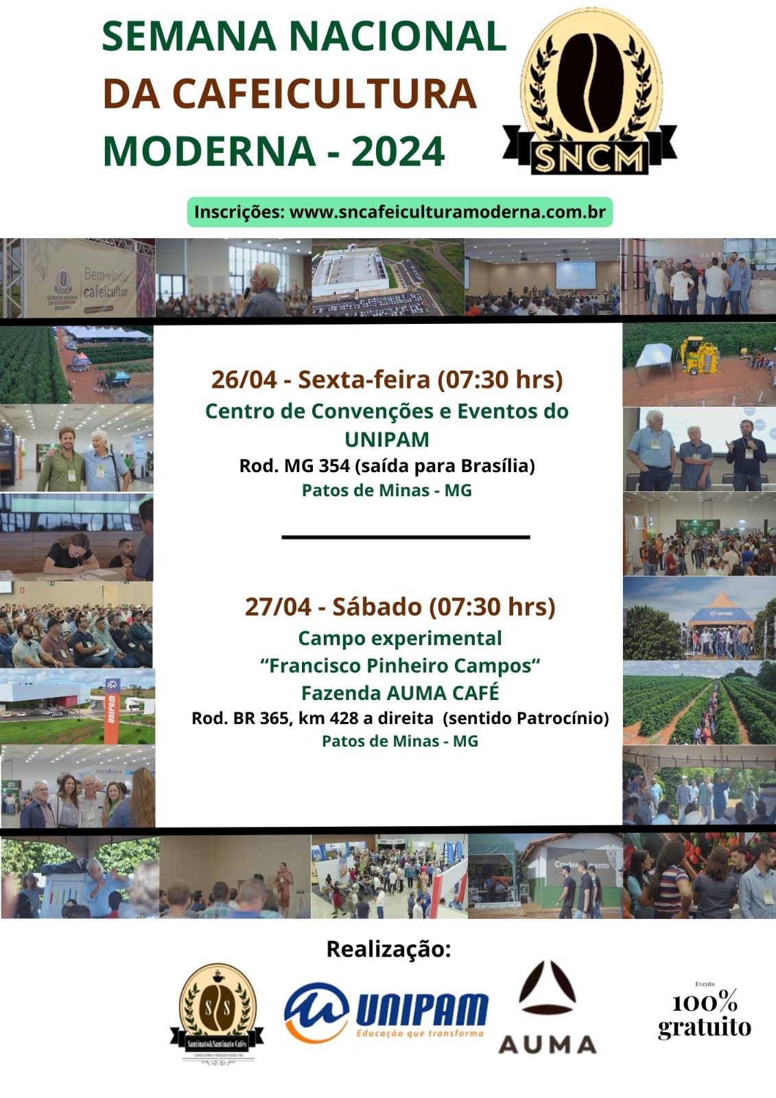 O Centro Universitário de Patos de Minas (UNIPAM), a Santinato & Santinato Cafés e a Auma promoverão, nos dias 26 e 27 de abril, a Semana Nacional da Cafeicultura Moderna (SNCM). O evento ocorrerá no Centro de Convenções e Eventos (CCE) e no Campo Experimental “Francisco Pinheiro Campos”.
