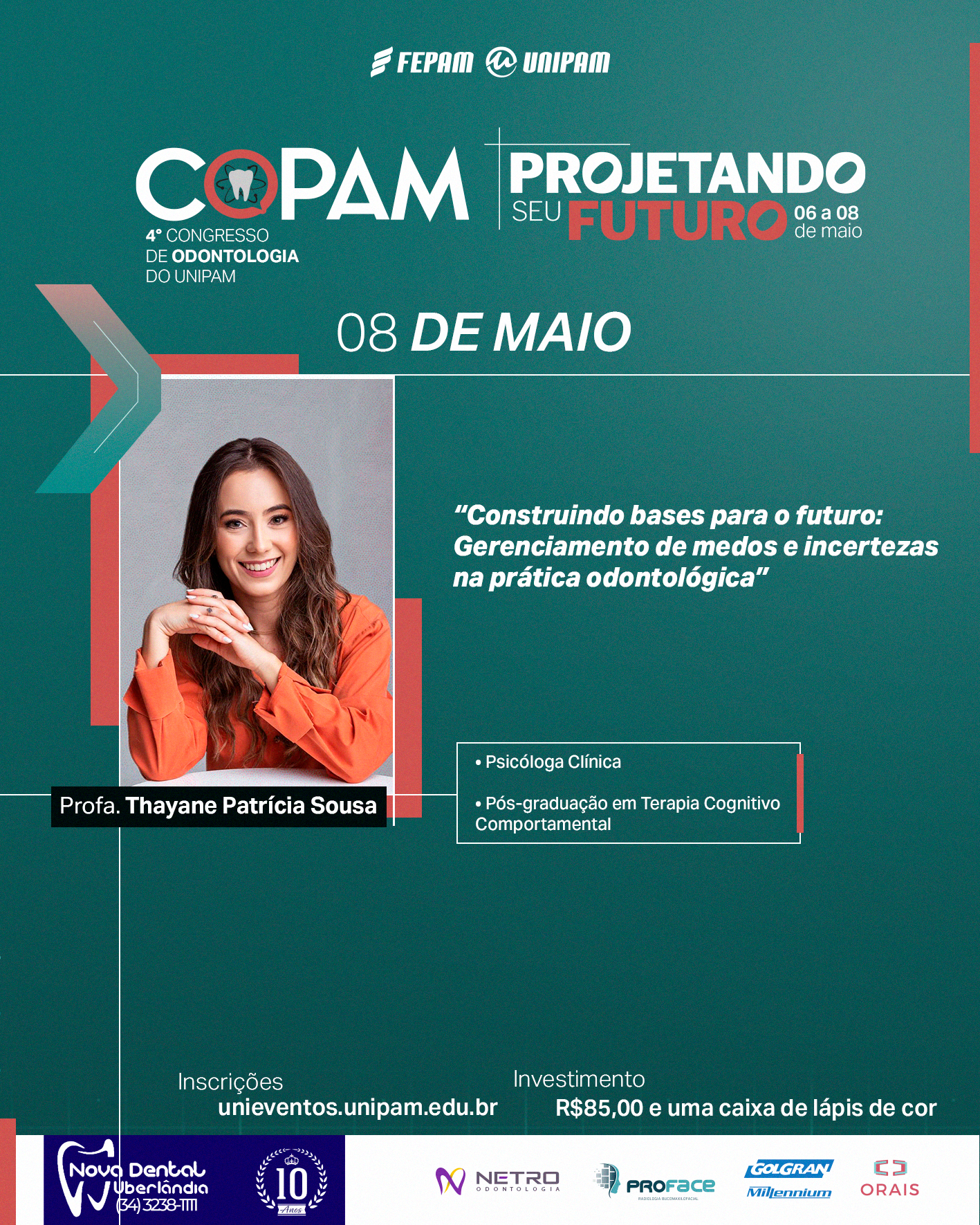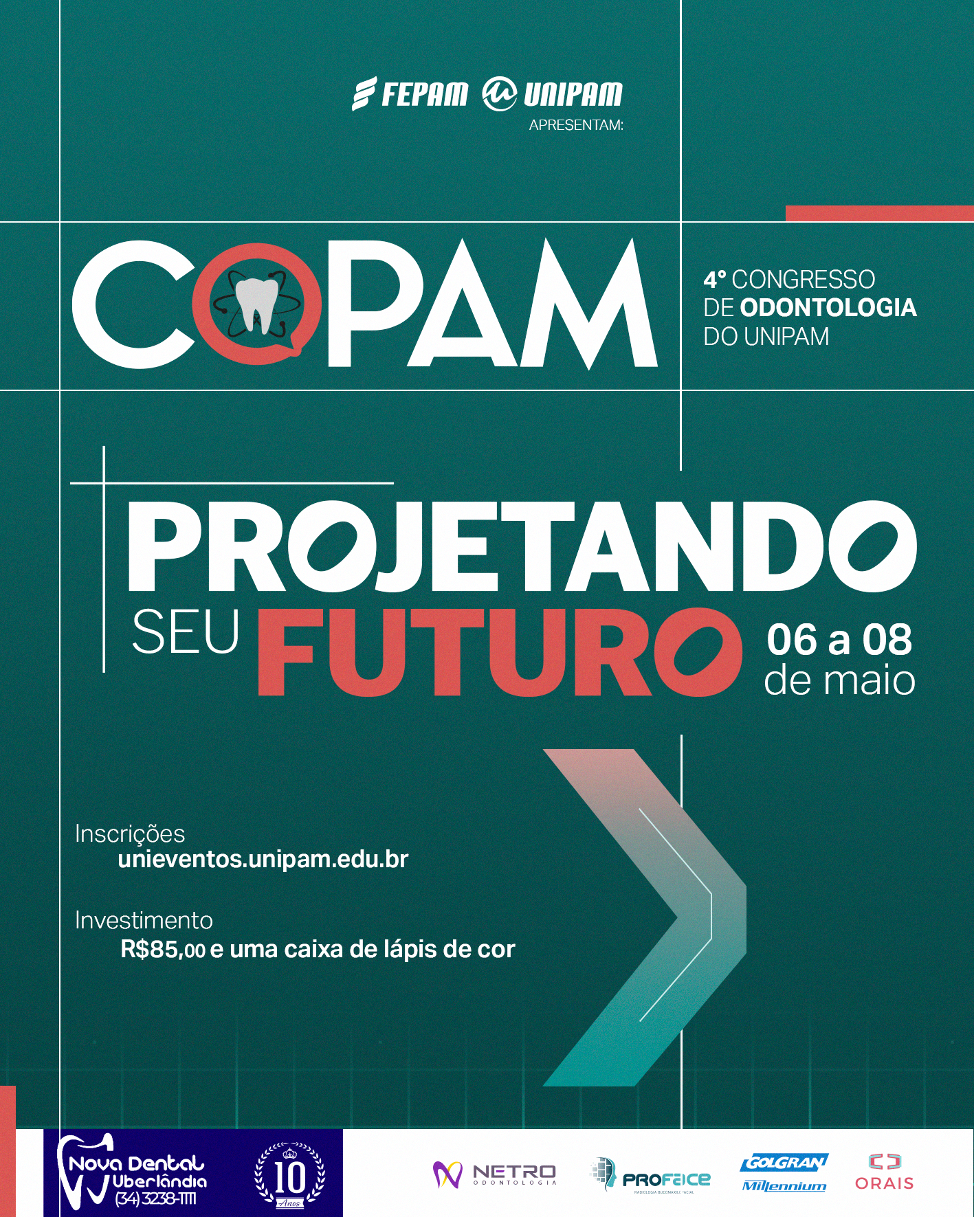 O Centro Universitário de Patos de Minas (UNIPAM) promoverá, de 06 a 08 de maio, no Centro de Convenções e Eventos (CCE) e no Bloco N, a IV edição do Congresso de Odontologia (COPAM) que, este ano, tem como tema “COPAM: Projetando seu Futuro”.