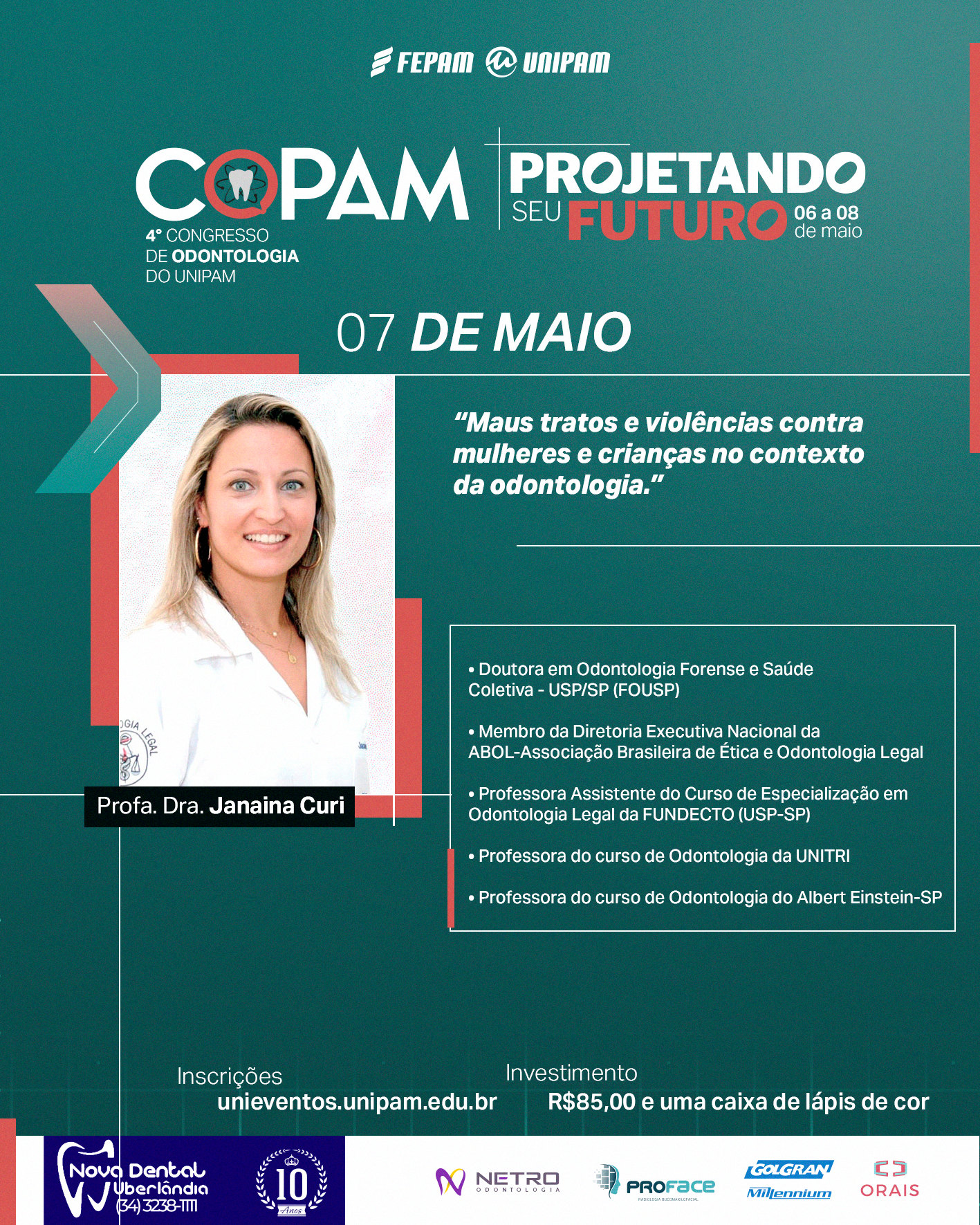 No segundo dia, 07 de maio (terça-feira), às 8h, no Centro de Convenções e Eventos (CCE), serão promovidas as palestras “Maus-Tratos e Violências Contra Mulheres e Crianças no Contexto da Odontologia” com a doutora em Odontologia Forense e Saúde Coletiva pela Universidade de São Paulo (USP), Janaina Curi; e “Traumatismo Dento-Alveolar” com a pós-doutora em Odontologia pela Universidade Federal de Uberlândia (UFU), Priscila Soares. Às 18h30, no Bloco N, ocorrerá a apresentação de trabalhos científicos.