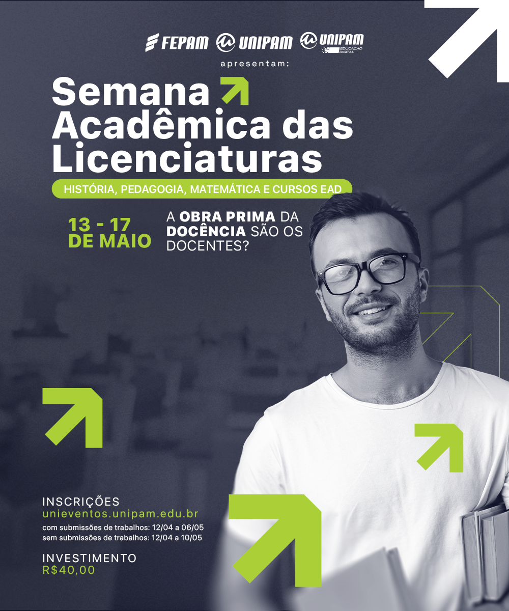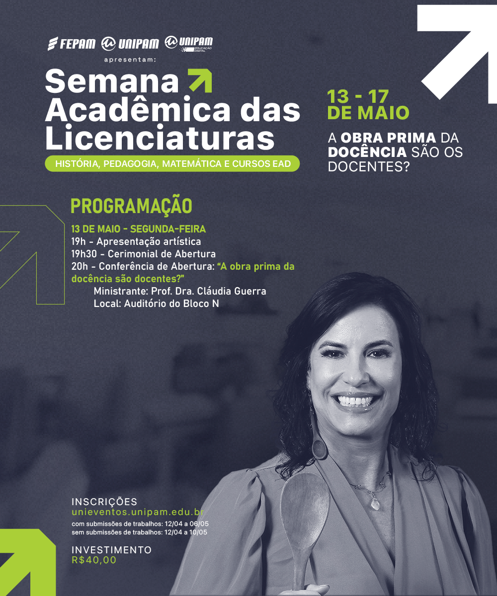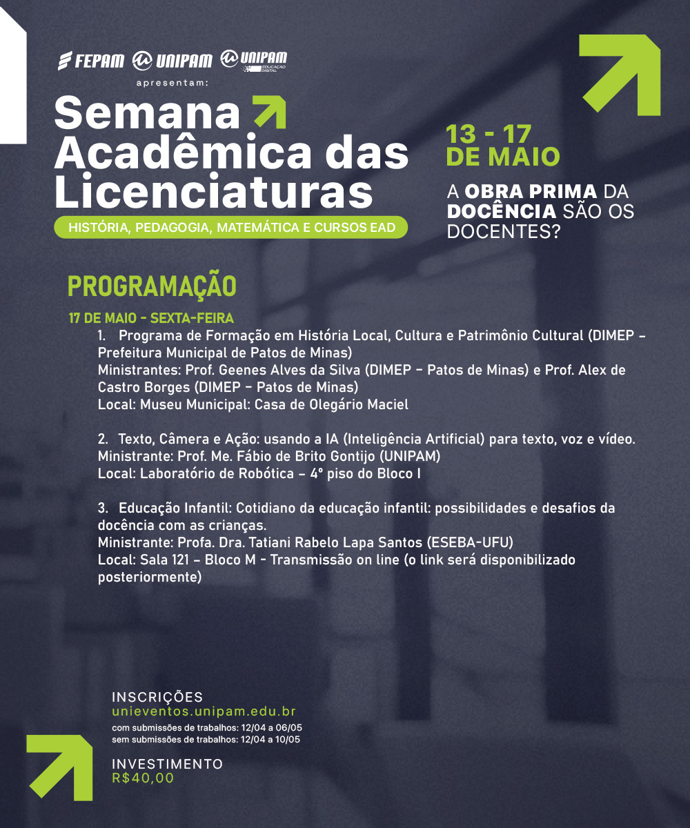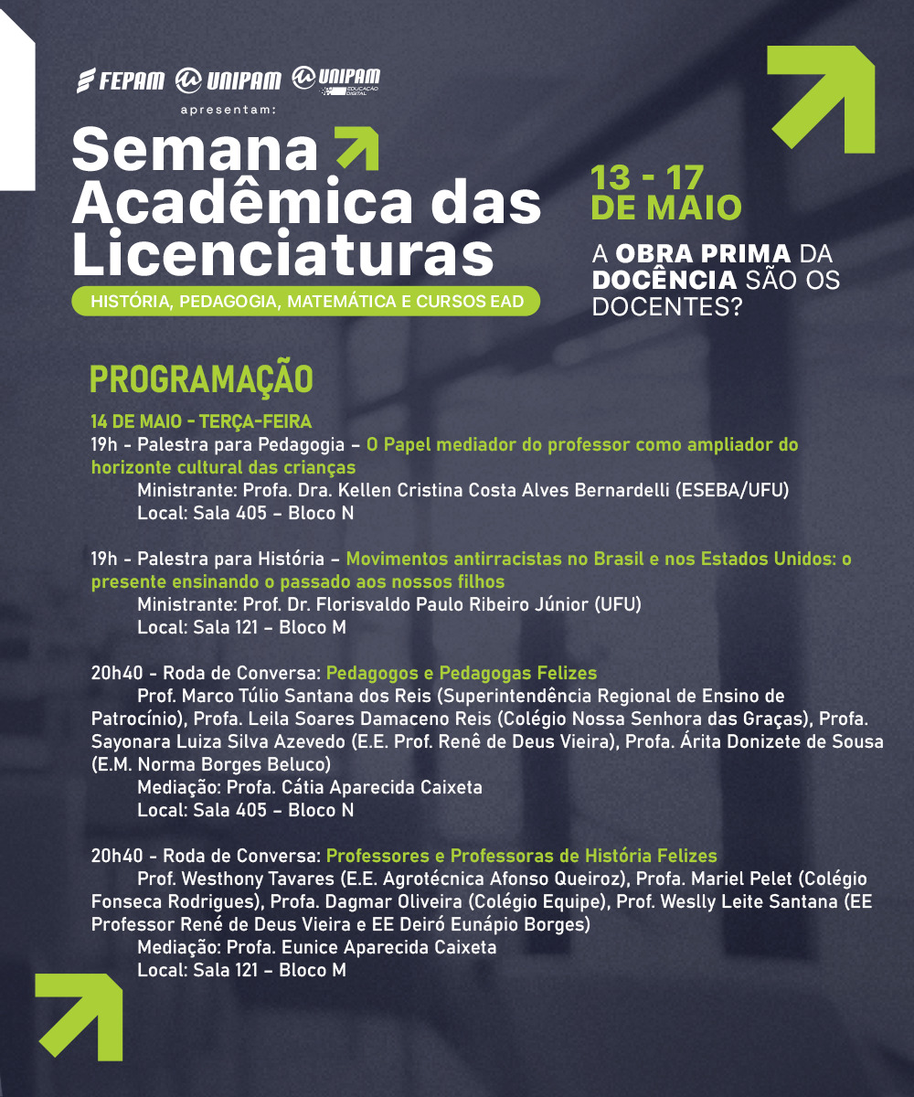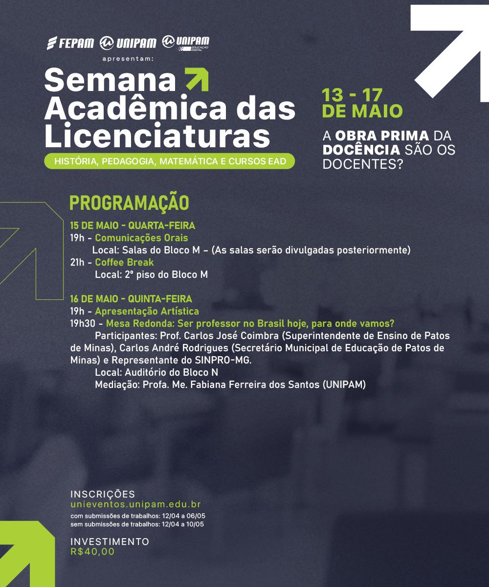 Os cursos de História, Matemática e Pedagogia do Centro Universitário de Patos de Minas (UNIPAM) promoverão, de 13 a 17 de maio, no campus da instituição, a Semana Acadêmica das Licenciaturas.