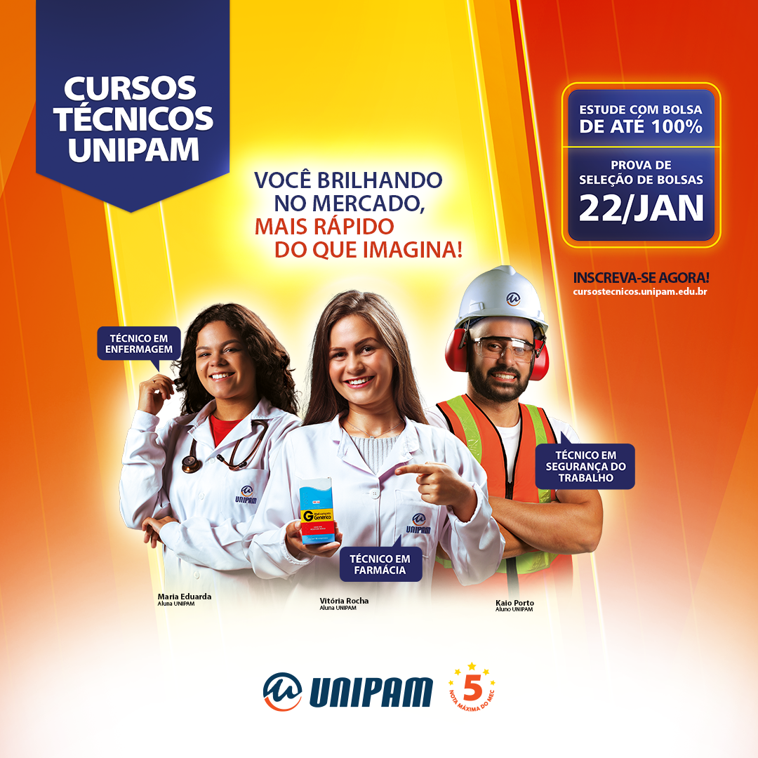 Serão concedidas bolsas de até 100%. Para participar do processo, os candidatos deverão se inscrever no site https://cursostecnicos.unipam.edu.br/. No dia do processo é necessário que o candidato traga documento de identificação com foto, caneta azul ou preta, lápis e borracha.