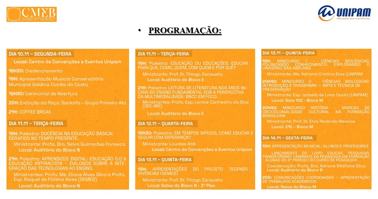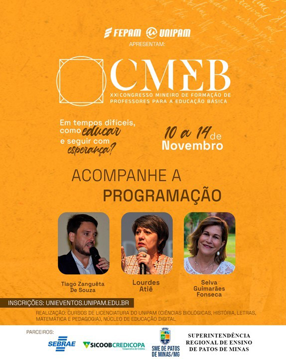 Os cursos de Ciências Biológicas, História, Letras, Matemática, Pedagogia e o Núcleo de Educação a Distância (NEAD) do Centro Universitário de Patos de Minas (UNIPAM), promoverão, entre os dias 10 e 14 de novembro, o XXI Congresso Mineiro de Formação de Professores para a Educação Básica (CMEB). O evento será realizado no Centro de Convenções e Eventos e no campus UNIPAM.