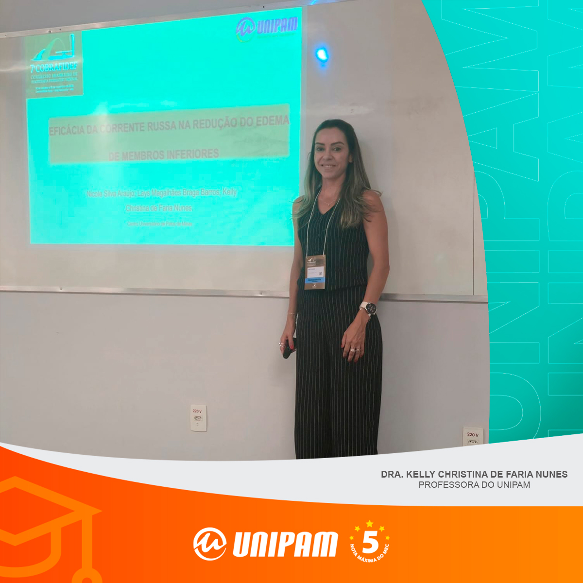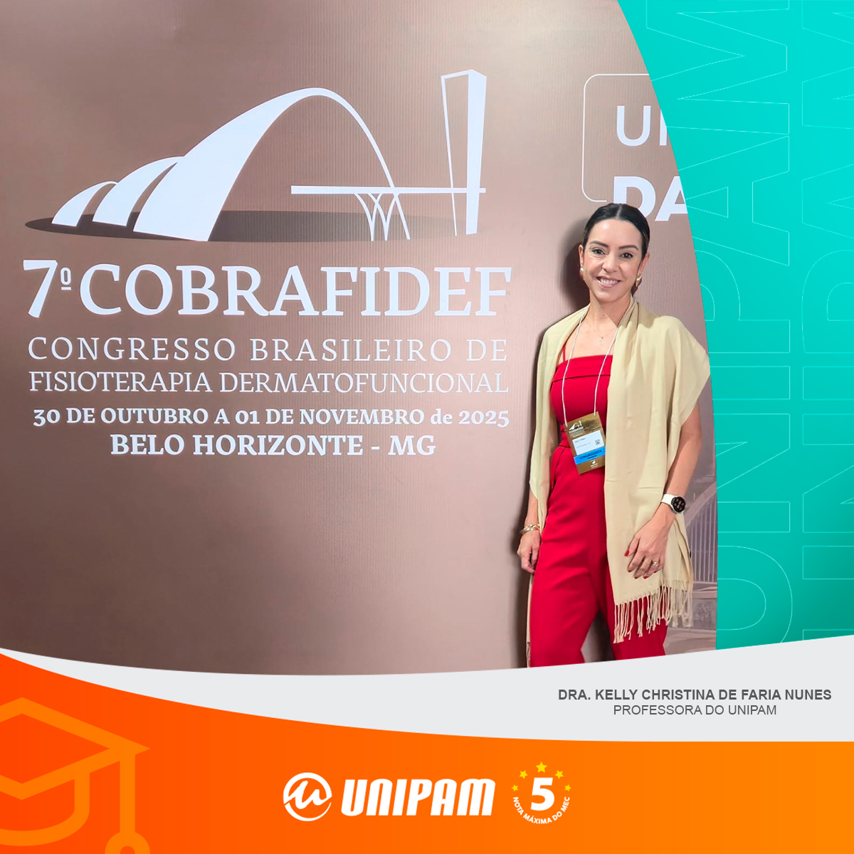 A professora Dra. Kelly Christina de Faria Nunes, do curso de Fisioterapia do Centro Universitário de Patos de Minas (UNIPAM), participou, recentemente, do “7º Congresso Brasileiro de Fisioterapia Dermatofuncional”, realizado em Belo Horizonte (MG). O evento teve como tema “Um Diálogo entre as Áreas: da Evidência à Clínica”.