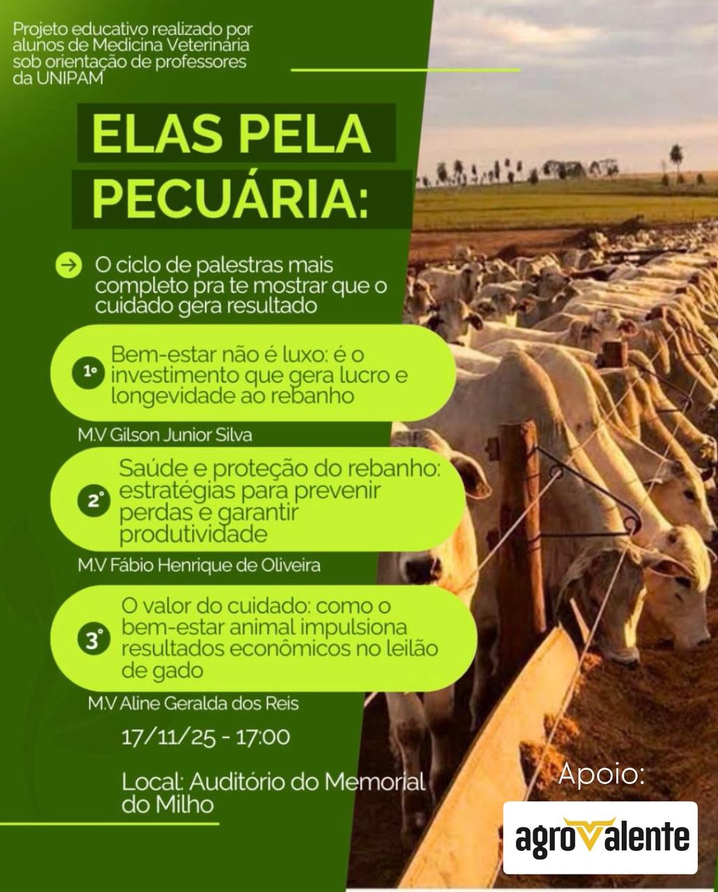 Alunos do curso de Medicina Veterinária do Centro Universitário de Patos de Minas (UNIPAM) promoverão, no dia 17 de novembro (segunda-feira), às 17h, no Auditório do Memorial do Milho, o evento “Elas pela Pecuária” como atividade da disciplina de Projeto Integrador.