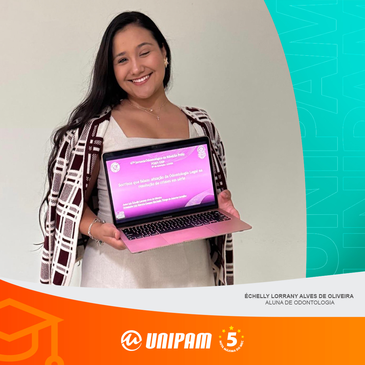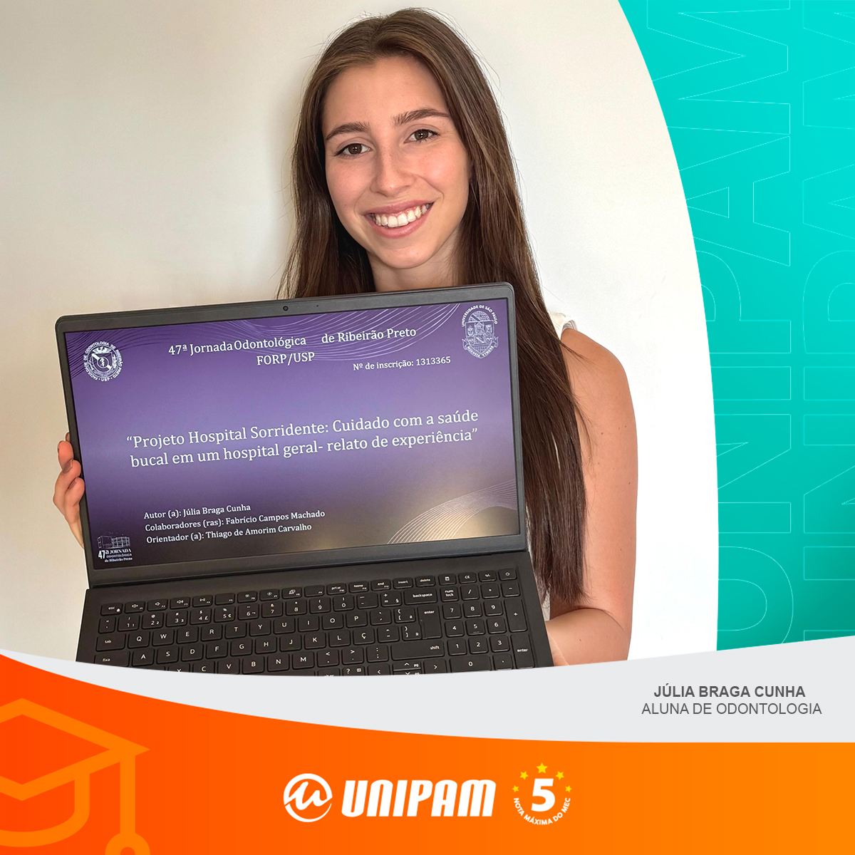 Já a aluna Vitória de Oliveira Rodrigues foi reconhecida com o prêmio de melhor trabalho, apresentado na categoria “Saúde Coletiva”, durante a Jornada Odontológica do Centro Universitário do Triângulo (UNITRI), na modalidade presencial.