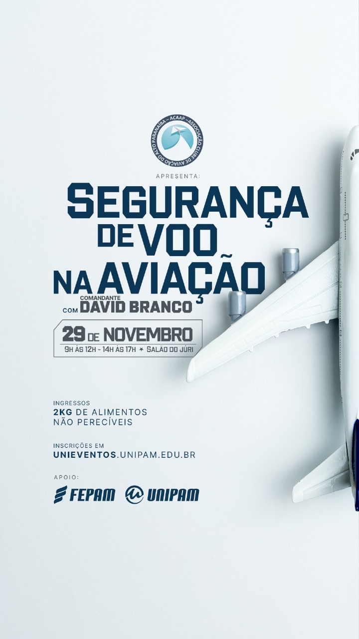 A Associação Clube de Aviação do Alto Paranaíba (ACAAP), com o apoio da Fundação Educacional de Patos de Minas (FEPAM) e do Centro Universitário de Patos de Minas (UNIPAM), promoverá, no dia 29 de novembro (sábado), das 9h às 12h e das 14h às 17h, no Salão do Júri, o evento “Segurança de Voo na Aviação”.