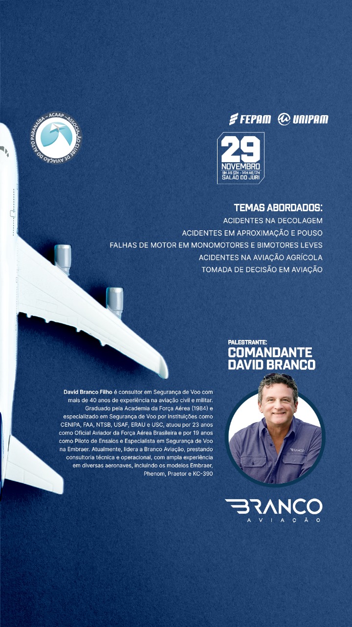 David Branco Filho é consultor em segurança de voo com mais de 40 anos de experiência na aviação civil e militar. Graduado pela Academia da Força Aérea (1984) e especializado em segurança de voo por instituições como CENIPA, FAA, NTSB, USAF, ERAU e USC, atuou por 23 anos como oficial aviador da Força Aérea Brasileira e por 19 anos como piloto de ensaios e especialista em segurança de voo na Embraer. Atualmente, lidera a Branco Aviação, prestando consultoria técnica e operacional, com ampla experiência em diversas aeronaves, incluindo os modelos Embraer, Phenom, Praetor e KC-390.