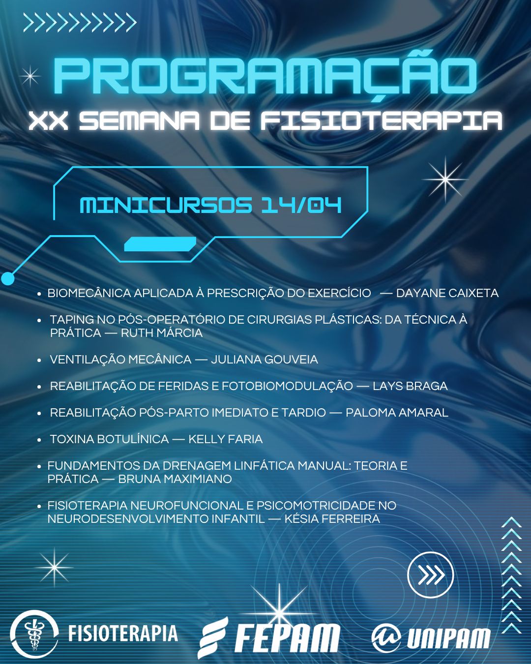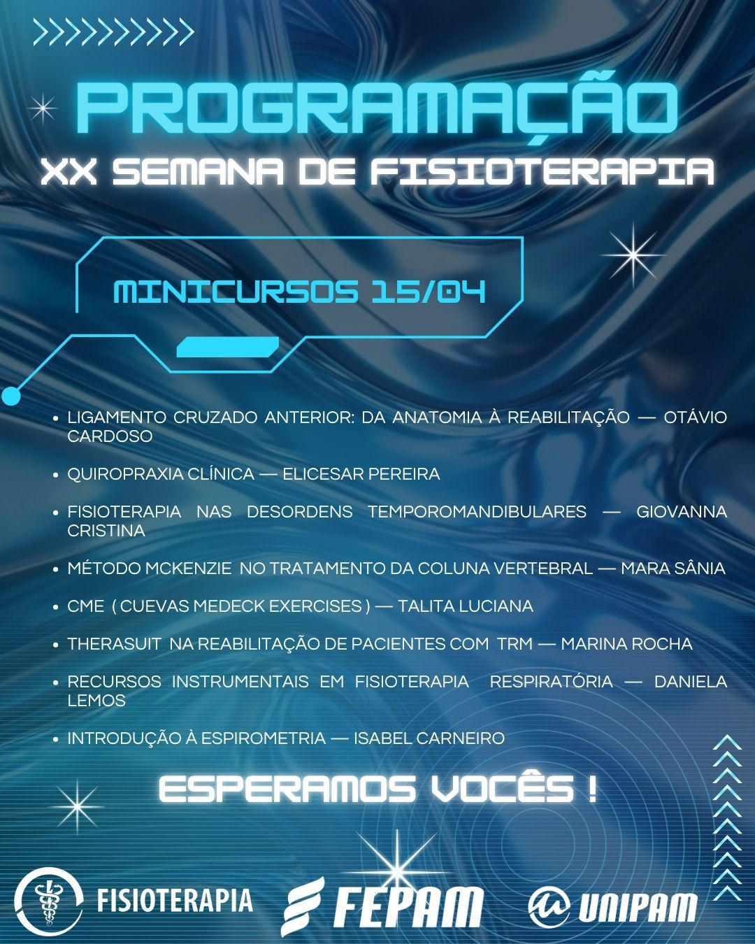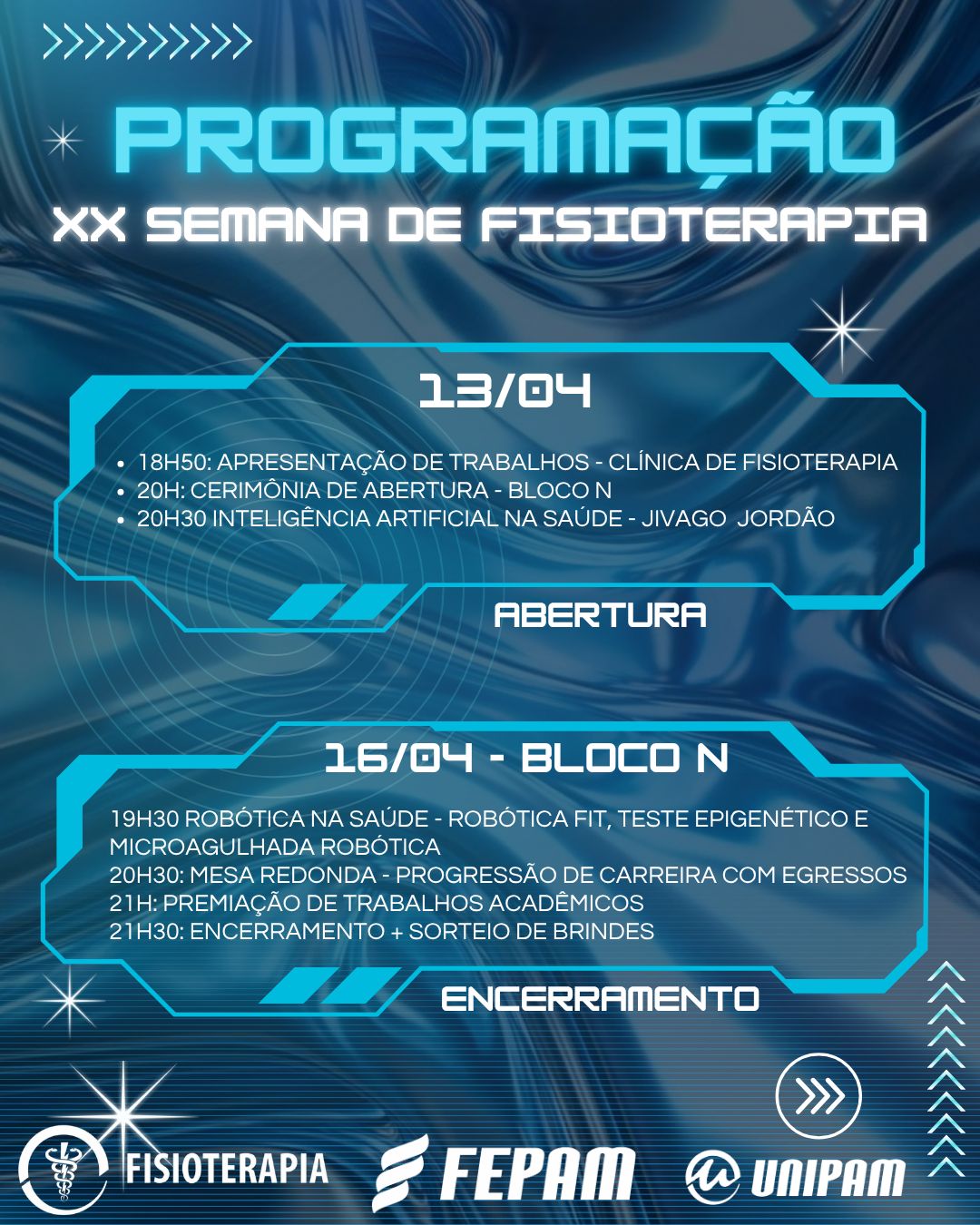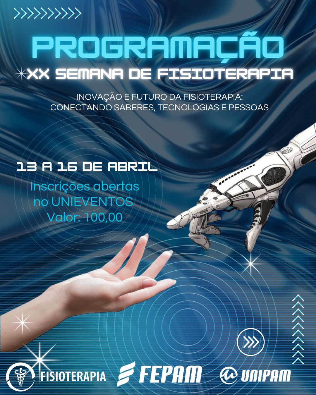 O curso de Fisioterapia do Centro Universitário de Patos de Minas (UNIPAM) promove, de 13 a 16 de abril, a XX Semana da Fisioterapia. Este ano, o evento tem como tema “Inovação e Futuro da Fisioterapia: Conectando Saberes, Tecnologias e Pessoas”.