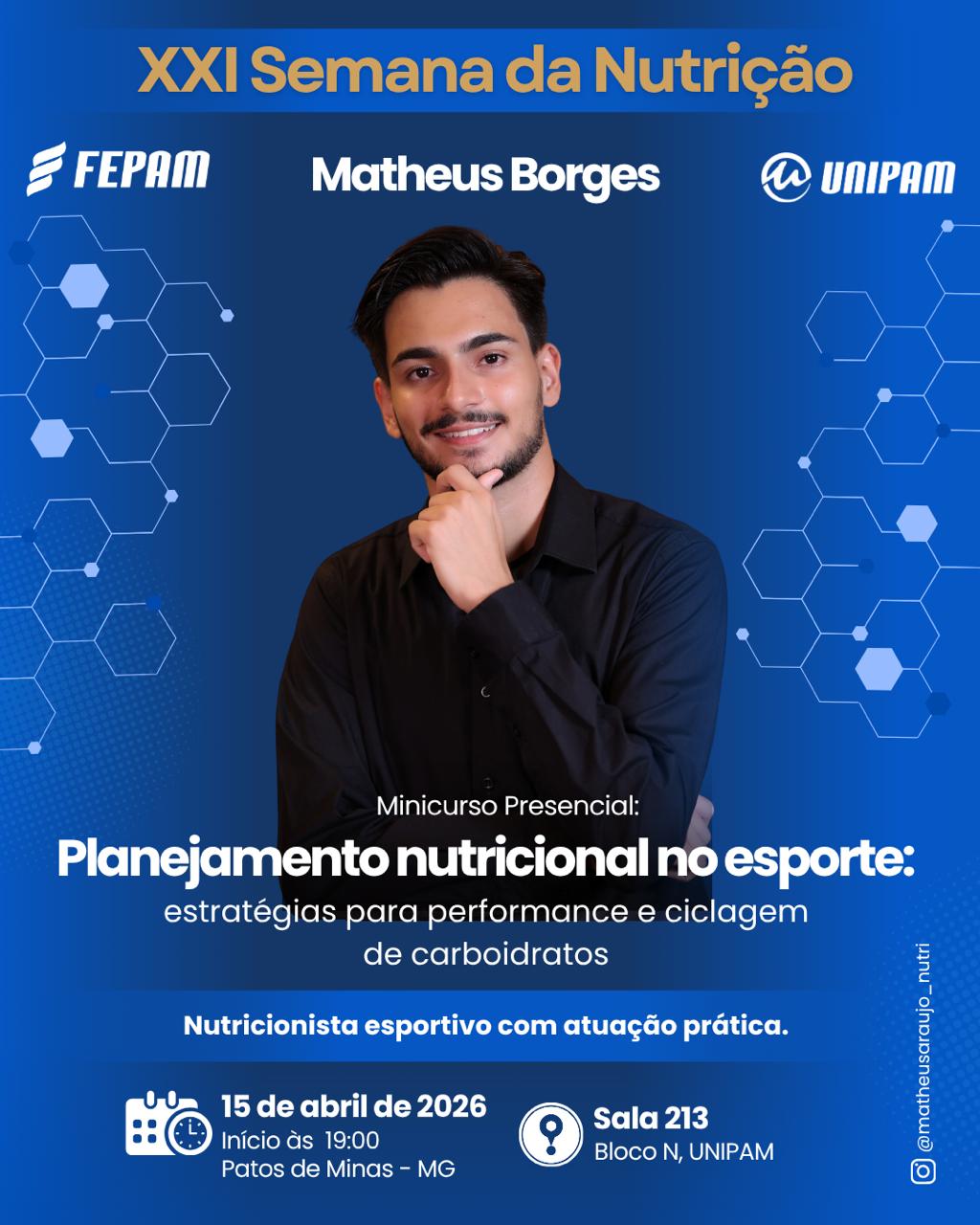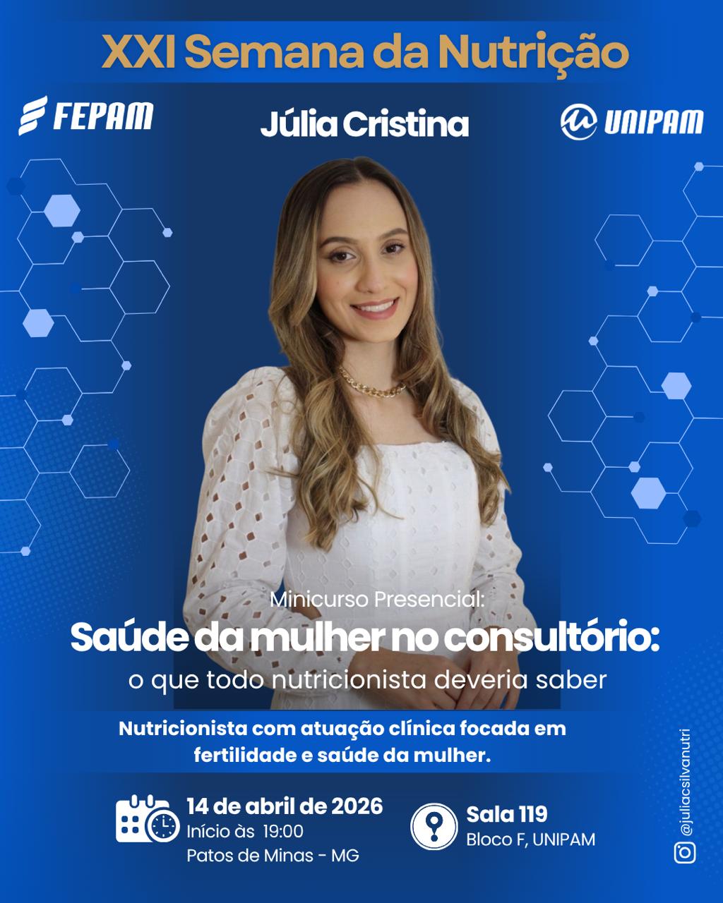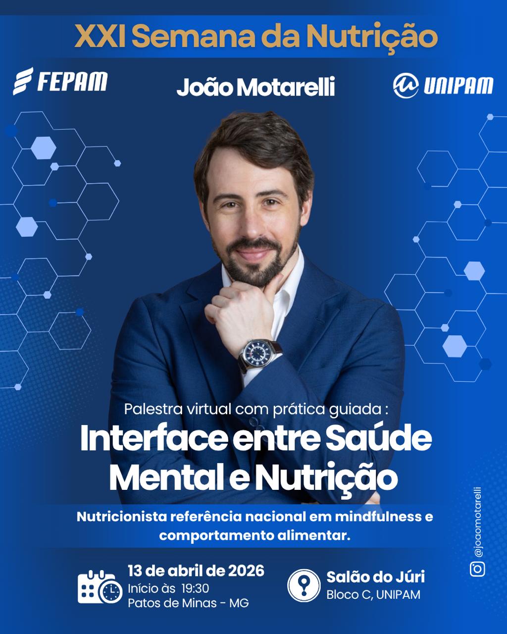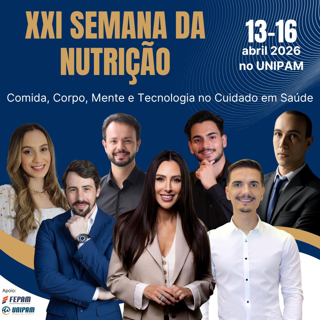 O Centro Universitário de Patos de Minas (UNIPAM) promoverá, de 13 a 16 de abril, a XXI Semana da Nutrição. O evento tem como tema “Comida, Corpo, Mente e Tecnologia no Cuidado em Saúde”.